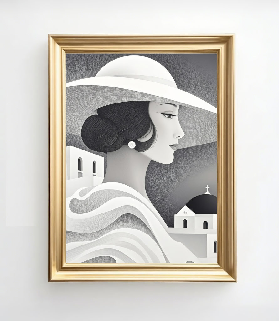 総じて、アールデコ風のエレガンスとモダンデザインのミニマリズムが融合した、美術作品として完成度の高い一枚です。