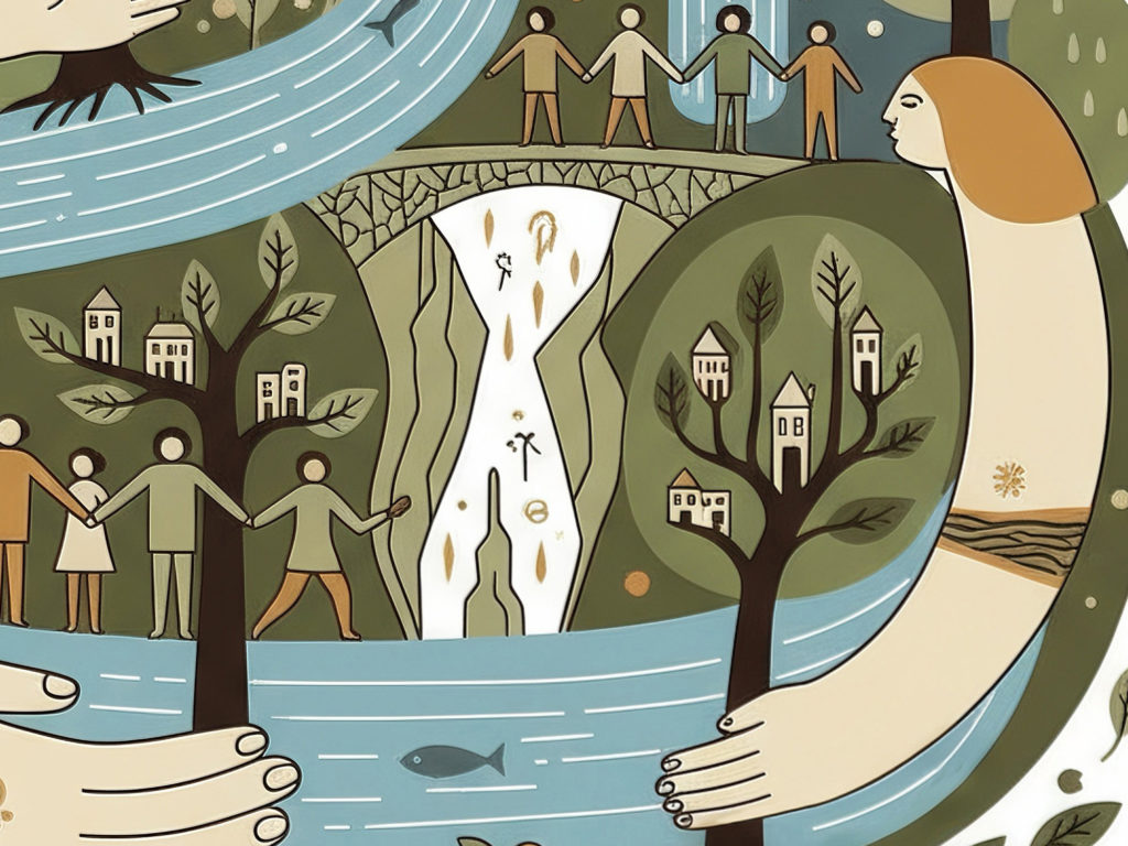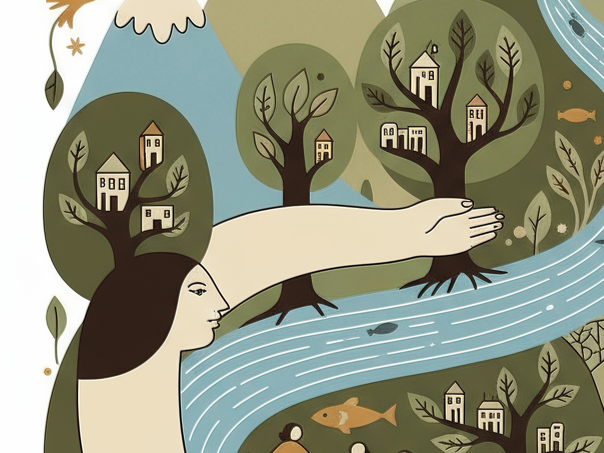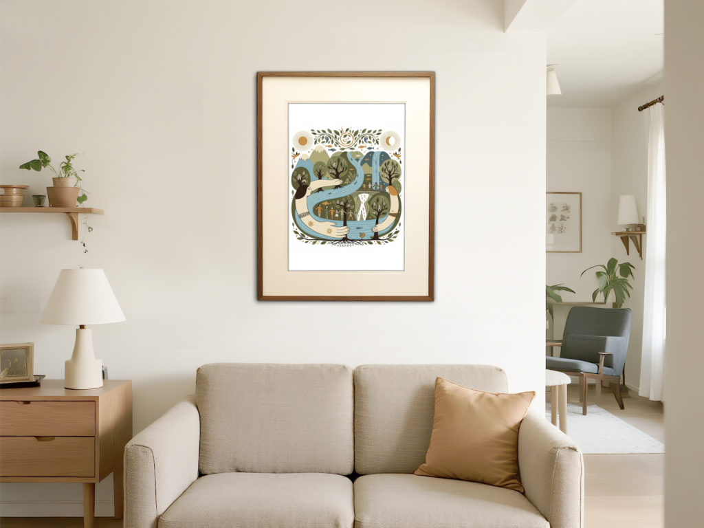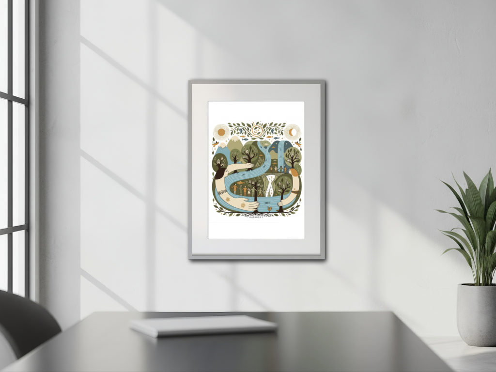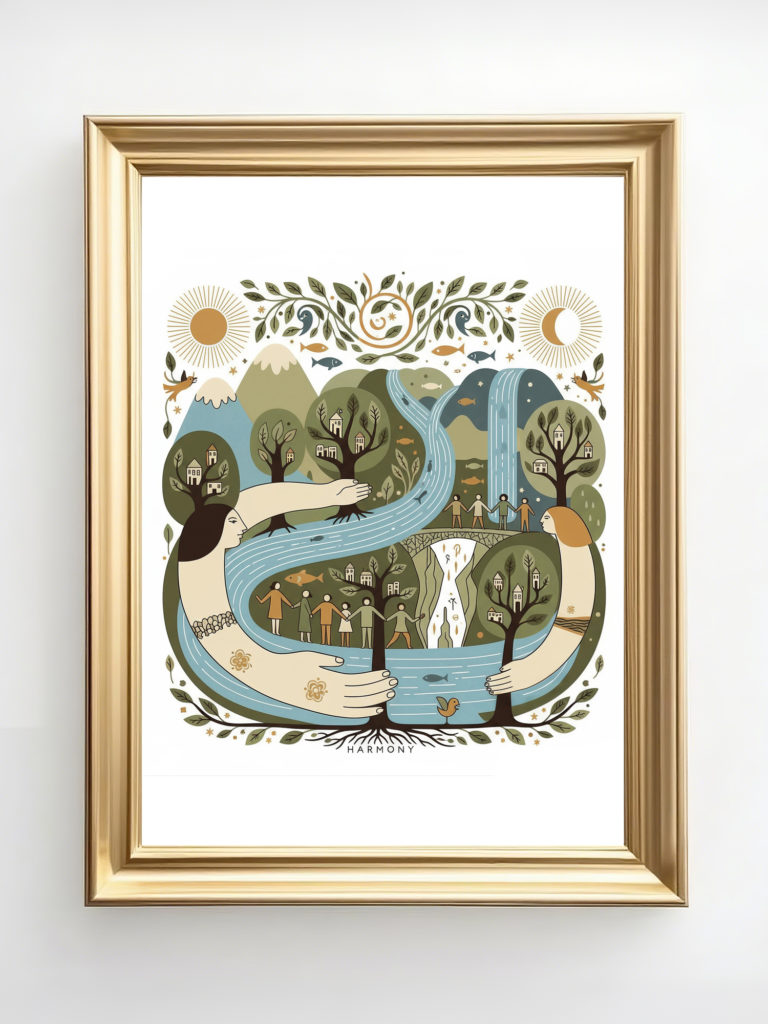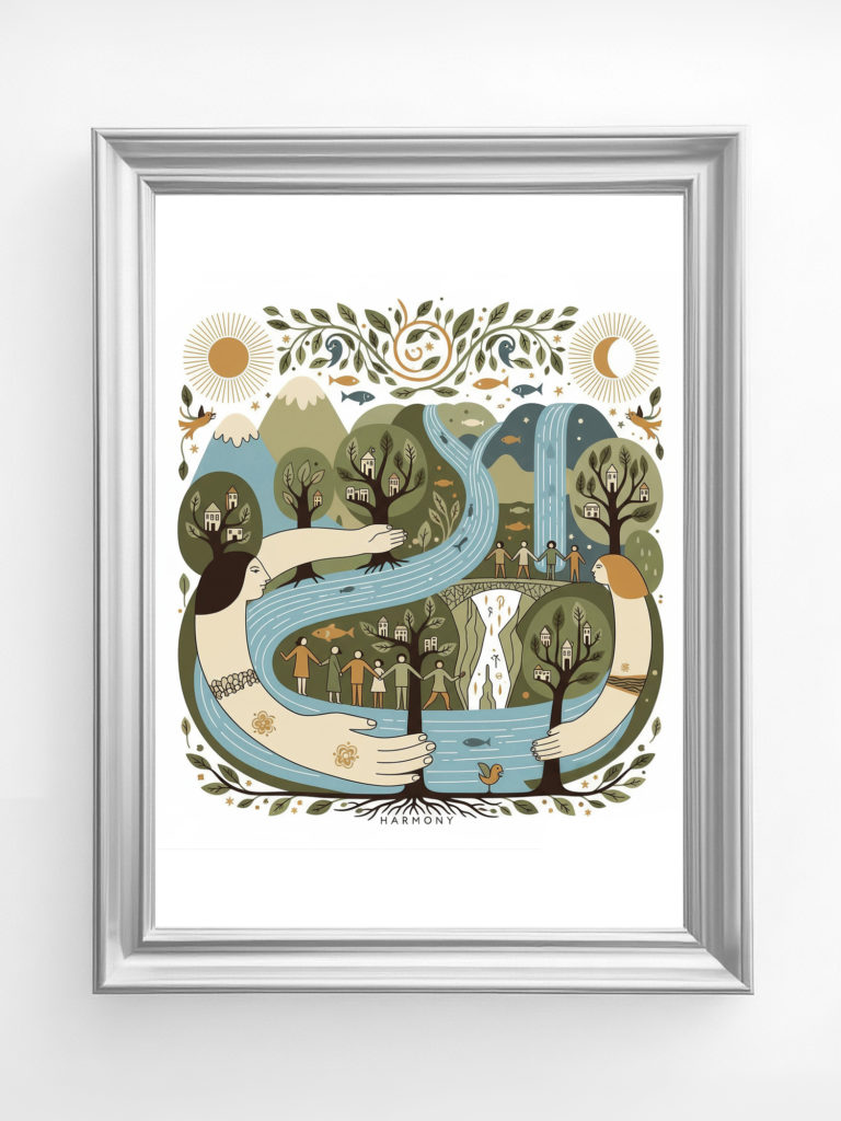 この作品は、川と森、そして人々を有機的に融合させ、「自然との調和」をテーマにしています。大きな川を抱きしめるような女性像は、地球や母なる自然を擬人化した象徴的なモチーフであり、優しさと包容力を感じさせます。 全体のデザインは曲線的で柔らかく、視線の流れが非常にスムーズ。観る人に安心感とつながりの感覚を与えます。