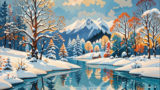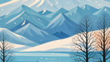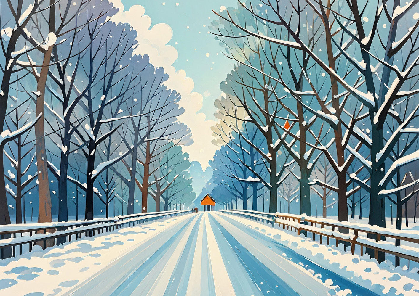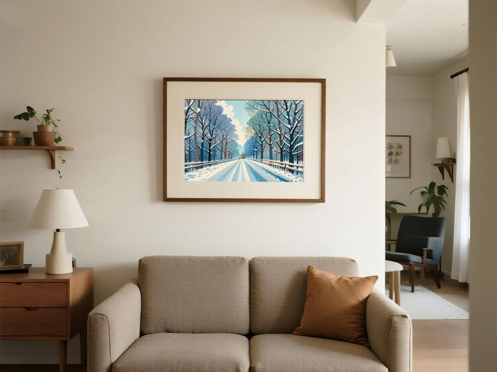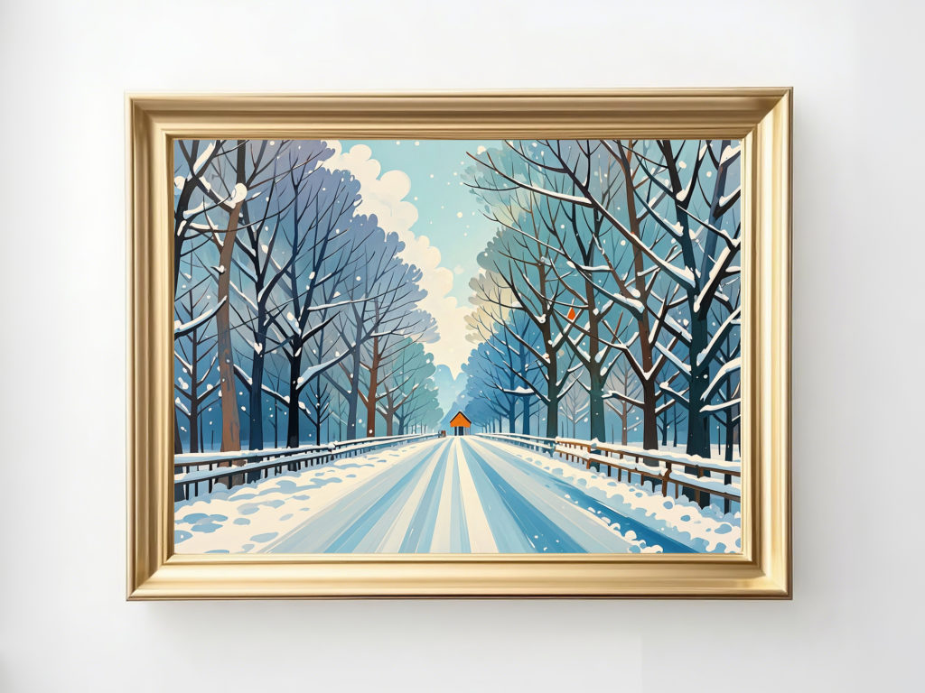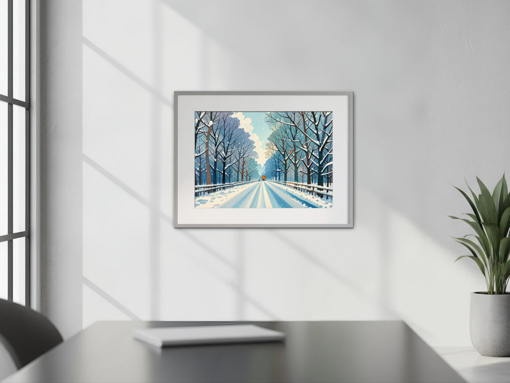 左右に並ぶ木々の道が遠方へと続き、冬の静けさと奥行きを強く感じさせる一枚です。赤い建物のアクセントが画面にリズムを生み、見る者の想像を広げます。ブルーグレーの落ち着いた配色はモダンな空間と相性がよく、引き締まった印象を演出します。