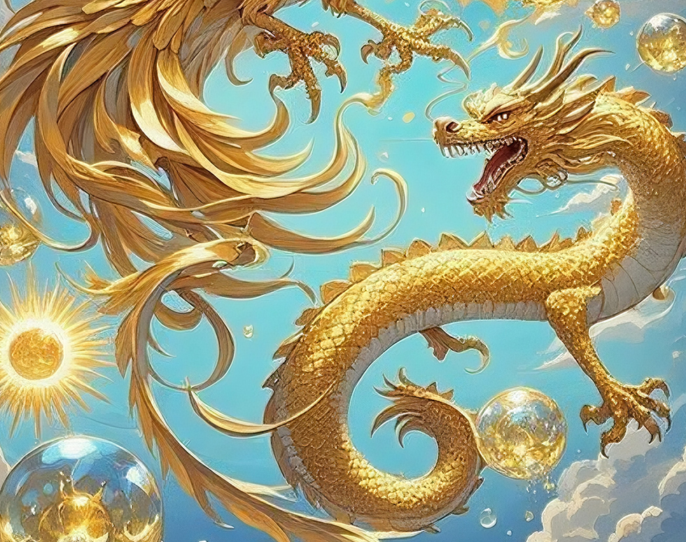 星々と光に包まれた龍鳳が、天からの祝福と繁栄を象徴する一枚。宝珠や星は「チャンス・縁・幸運の引き寄せ」を意味し、思いがけない良い流れを呼び込みます。華やかさの中にも調和があり、金運・人間関係運・評価運をバランス良く高めたい方に最適。日常を少し格上げしたい方のお守り壁紙としておすすめです。