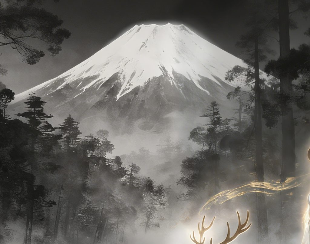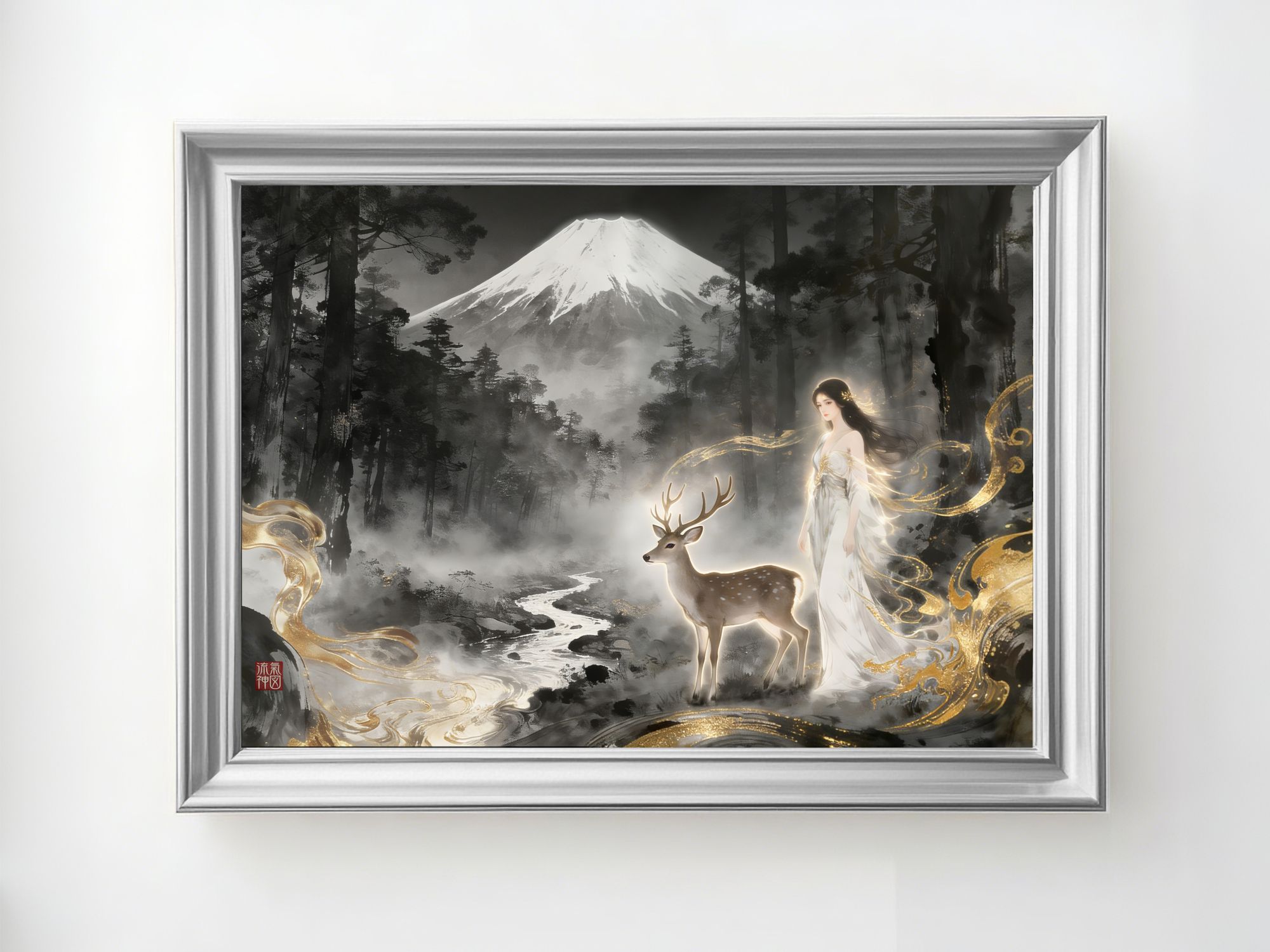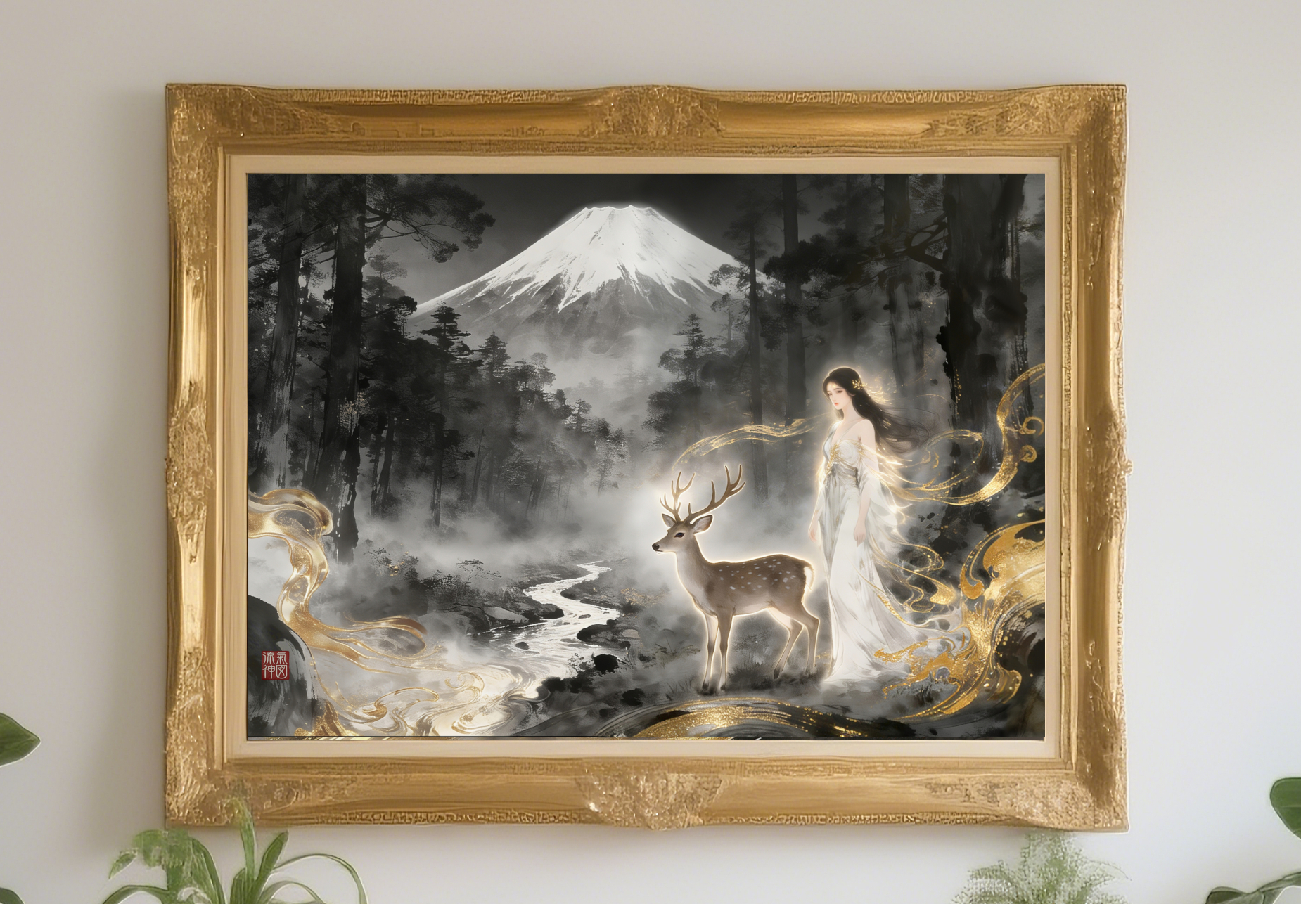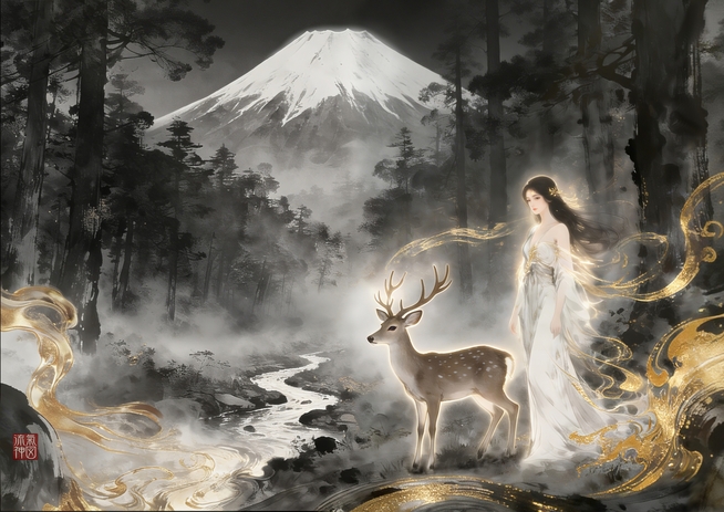 墨絵のような深い森に立つ鹿と、金の気をまとった霊的な女性。