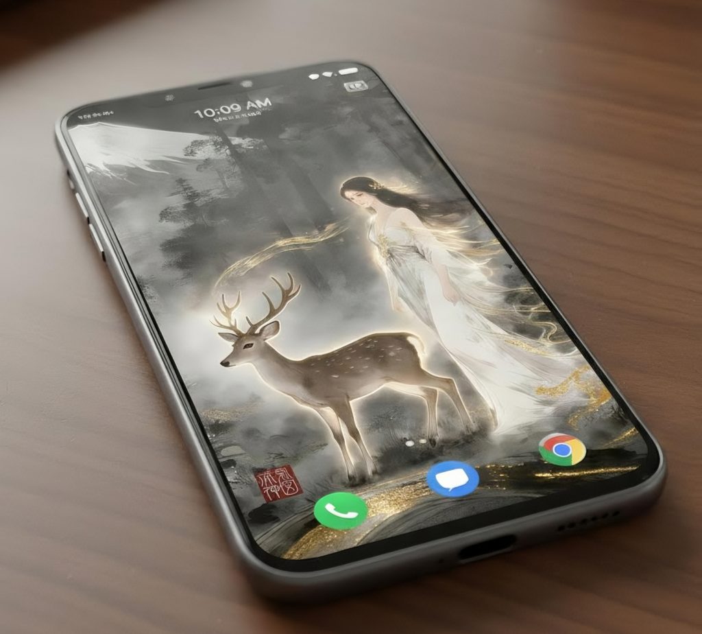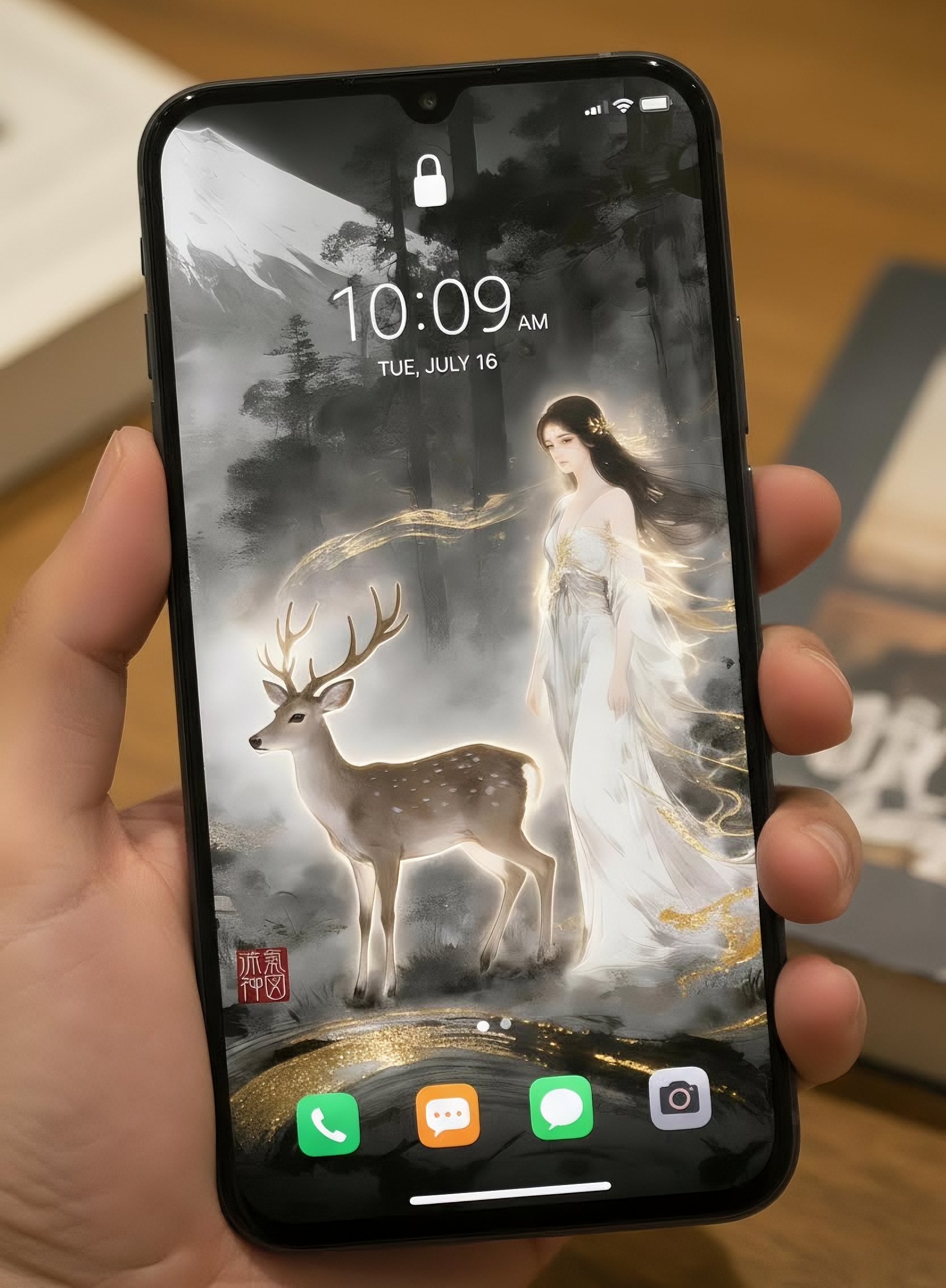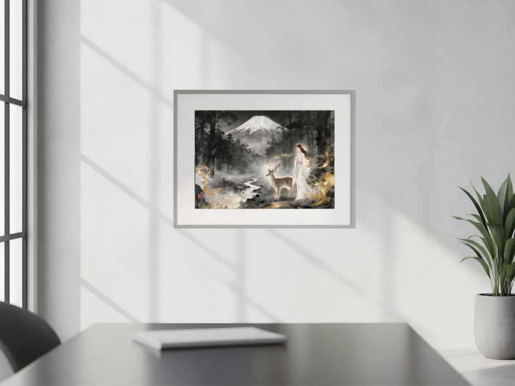 墨絵のような深い森に立つ鹿と、金の気をまとった霊的な女性。