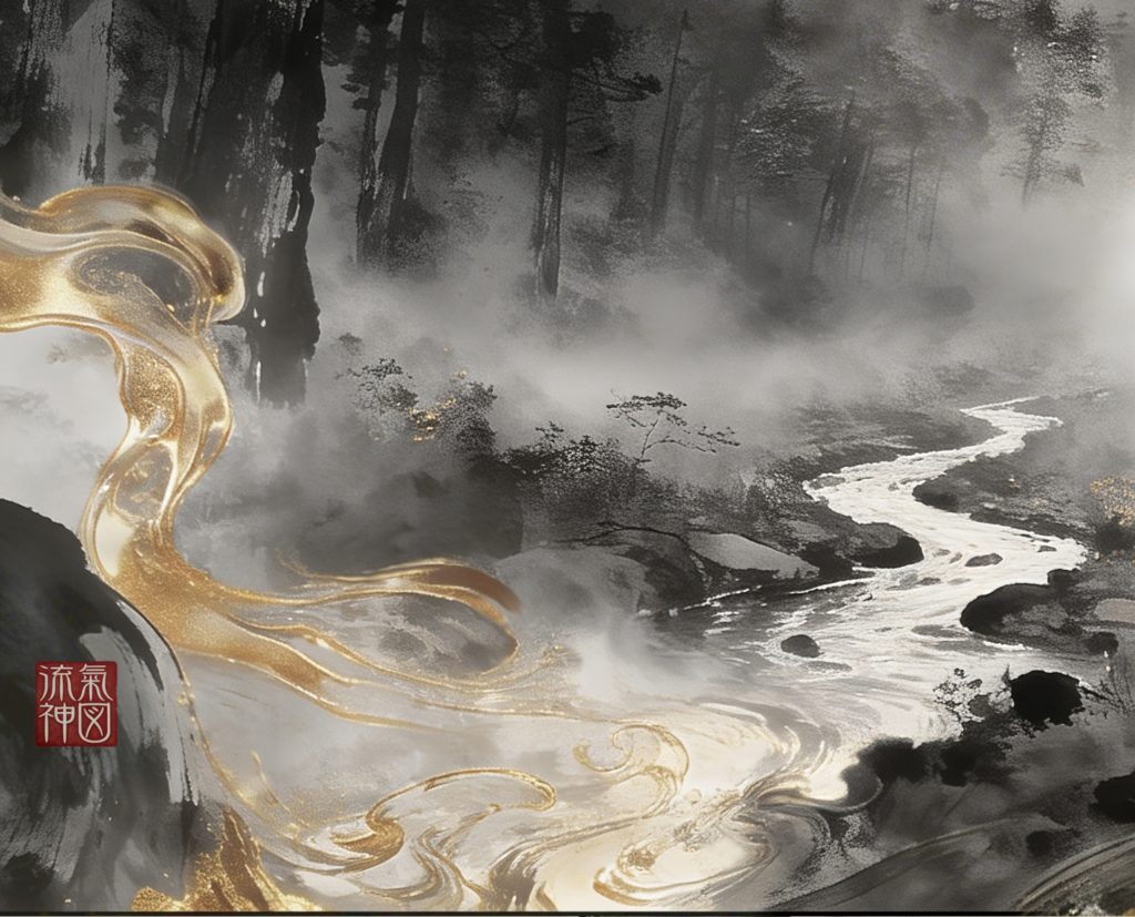闇と光、静と動が交錯するこの作品は、「過去の浄化」と「新しい運命への移行」を象徴します。黒は吸収と終焉、金は再生と繁栄。人生の転機や、内面的な成長を後押しする力強いスピリチュアルアートです。