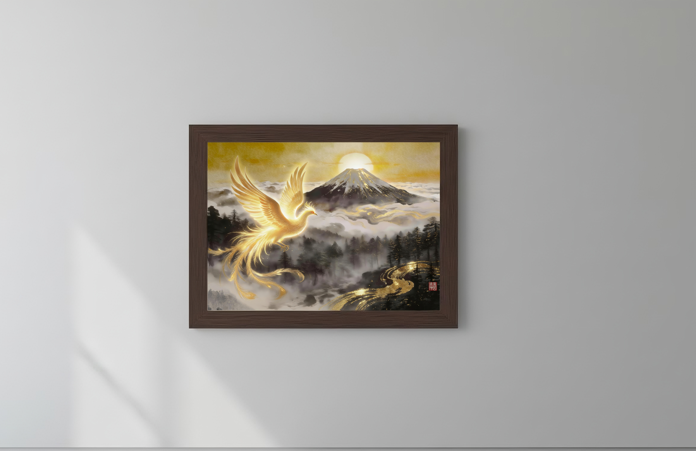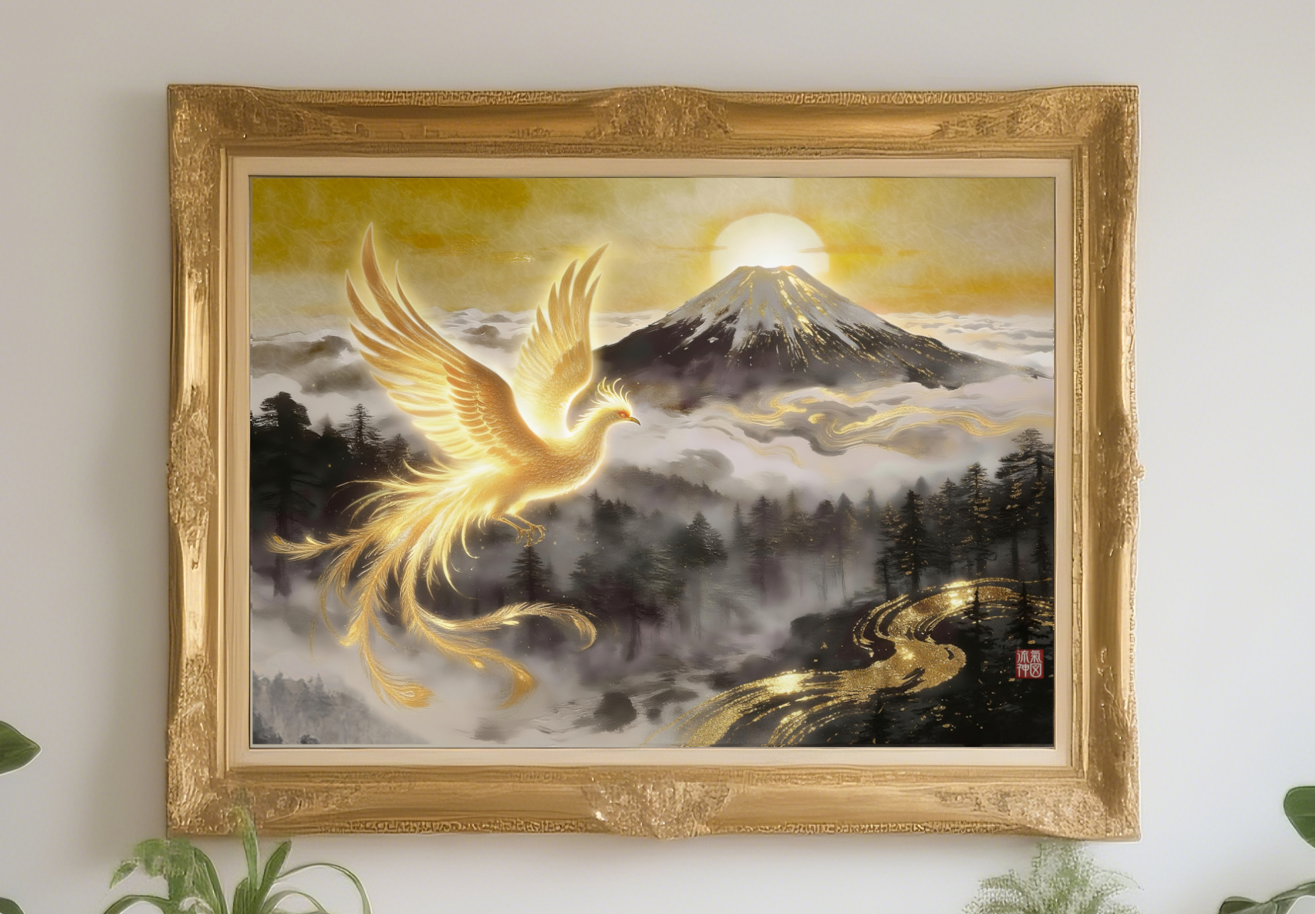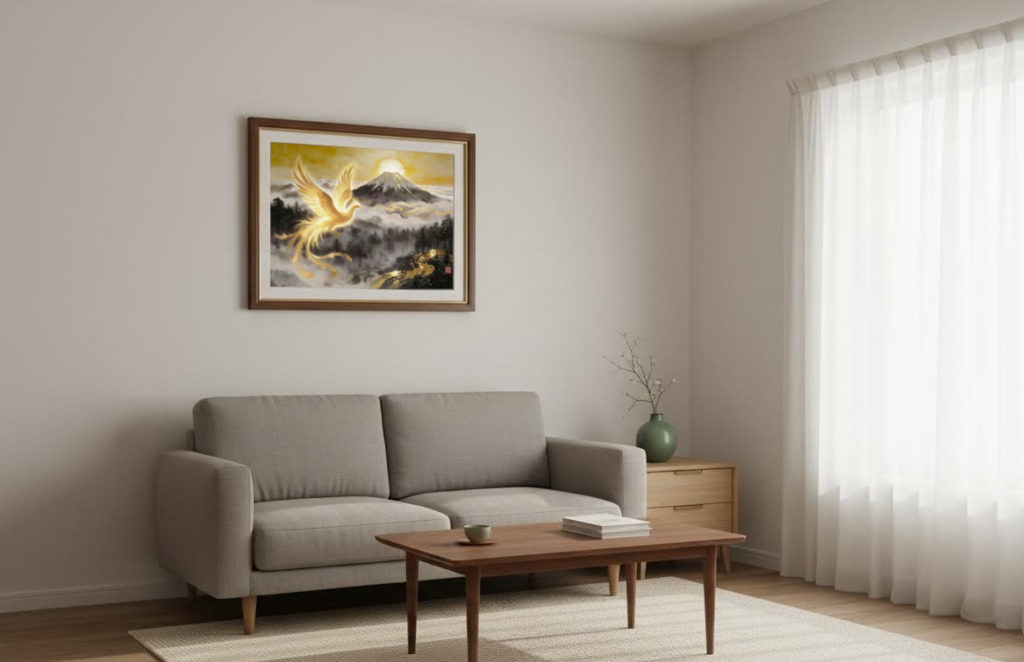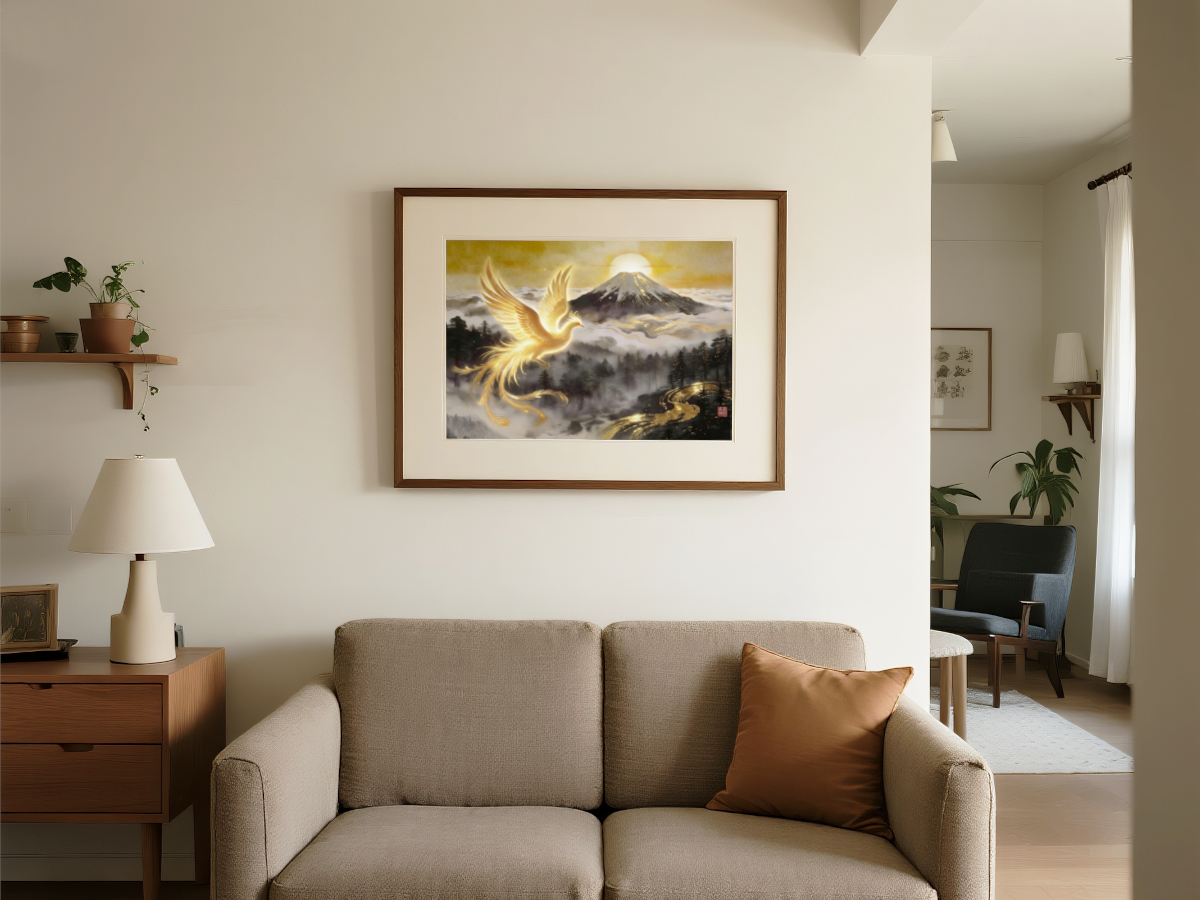 雲海に包まれた富士山、その背後から昇る黄金の太陽。それを背景にして飛翔する金色に輝く鳳凰は、「個人の運命が大きな舞台へ移行する瞬間」を象徴しています。自然・霊性・成功が完全に調和した構図で、人生の格が一段階上がる前兆を感じさせる、非常に力強い開運アートです。