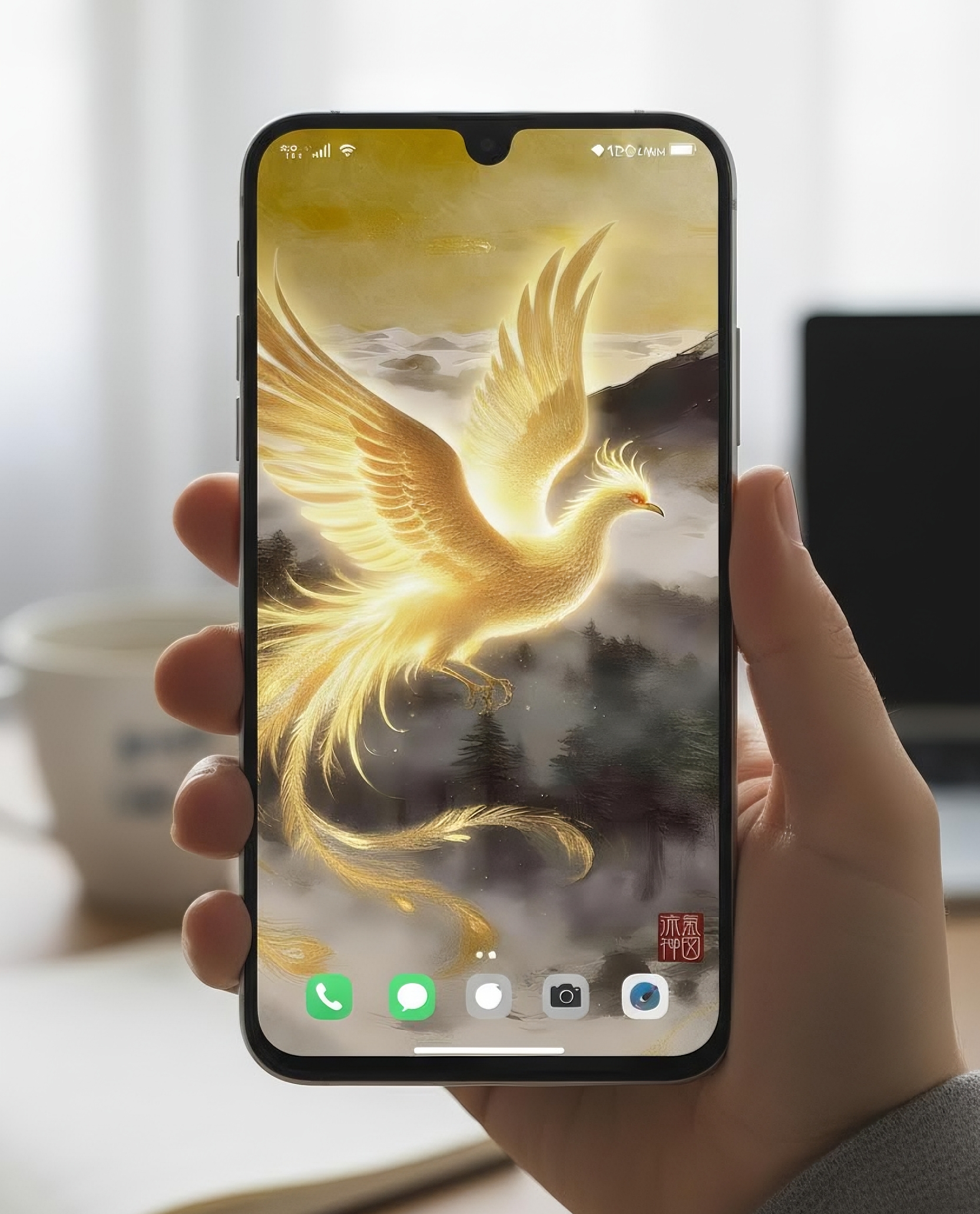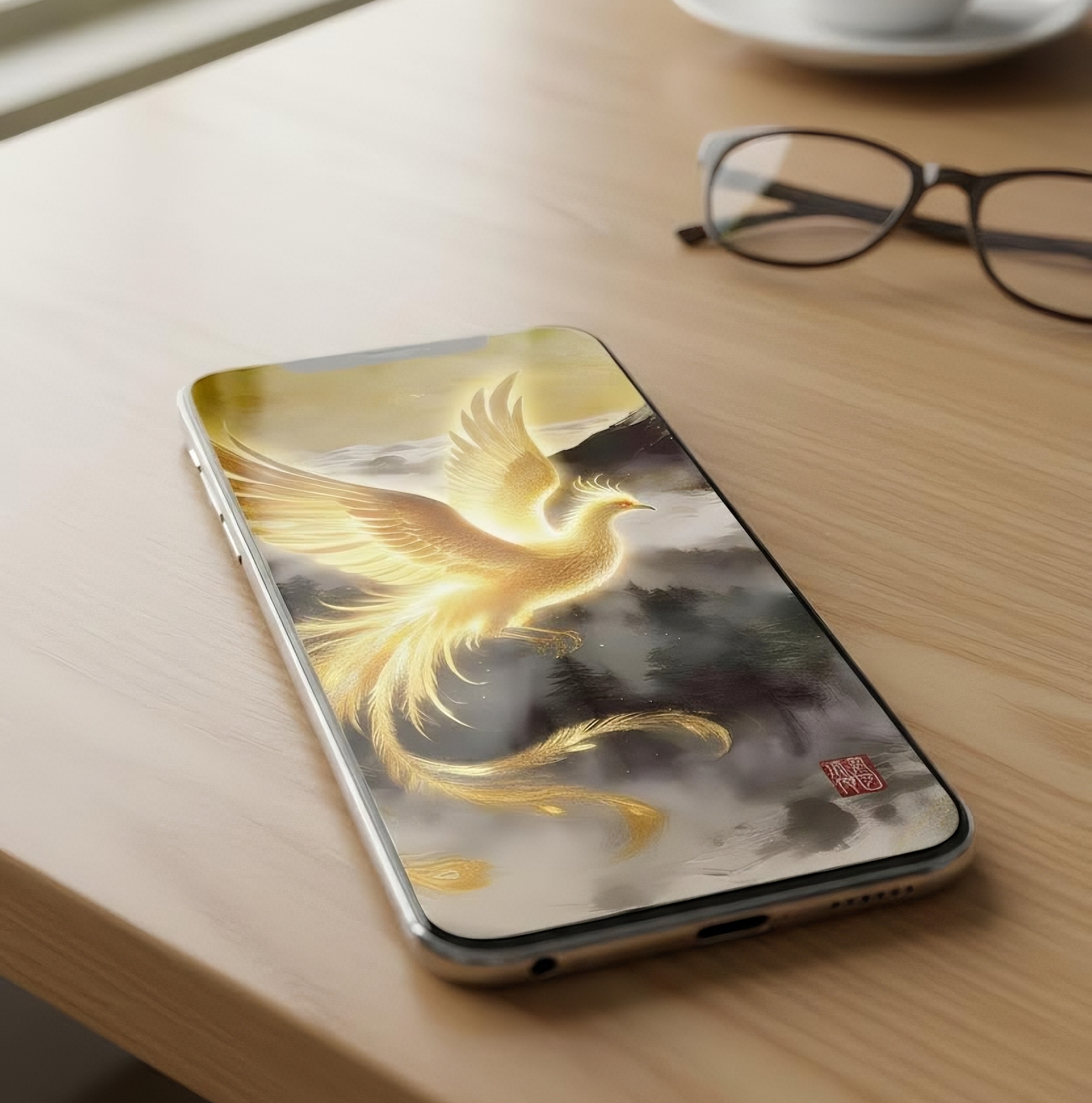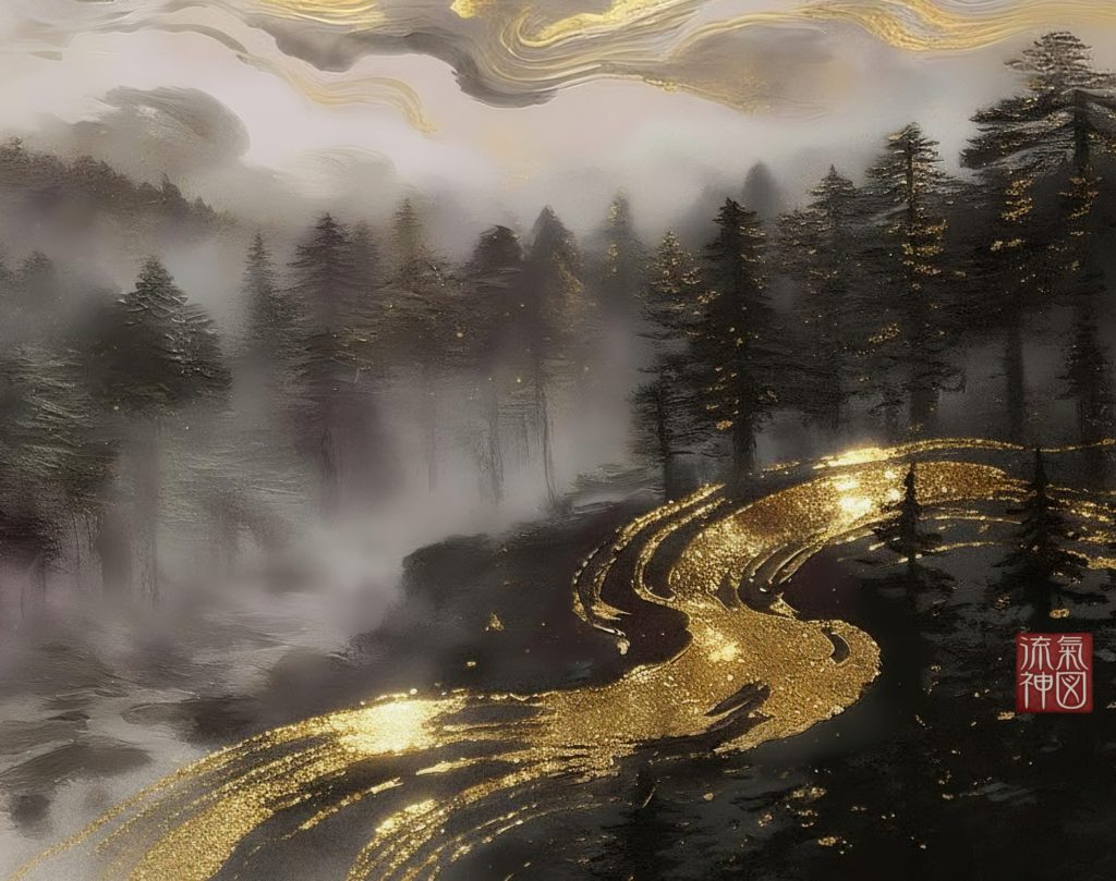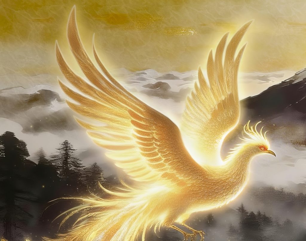 雲海に包まれた富士山、その背後から昇る黄金の太陽。それを背景にして飛翔する金色に輝く鳳凰は、「個人の運命が大きな舞台へ移行する瞬間」を象徴しています。自然・霊性・成功が完全に調和した構図で、人生の格が一段階上がる前兆を感じさせる、非常に力強い開運アートです。