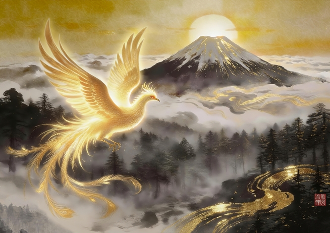 《金色に輝く鳳凰と富士山》は
