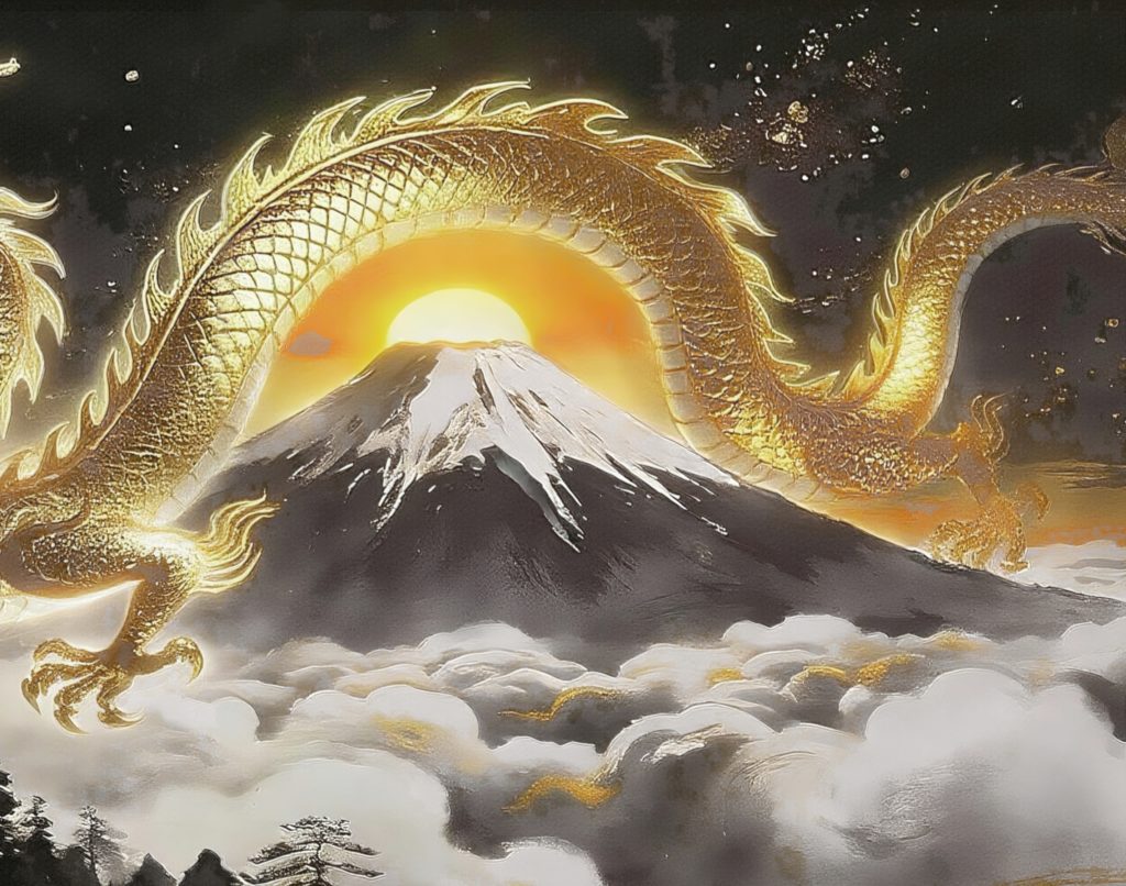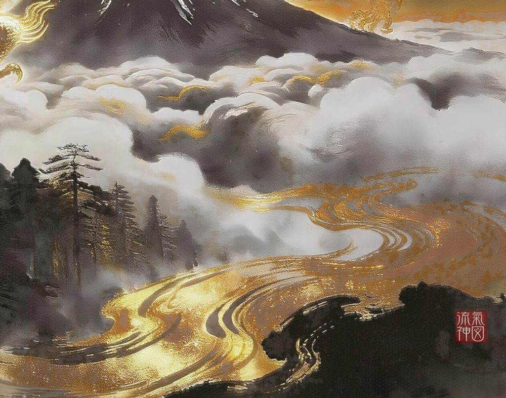 金龍は、古来より「運気を動かし、上昇へ導く象徴」とされてきた存在です。 この作品は、雄大な金龍が山々と光の中を舞い、 停滞した流れを押し流し、新しい風と変化を呼び込むイメージで制作しました。