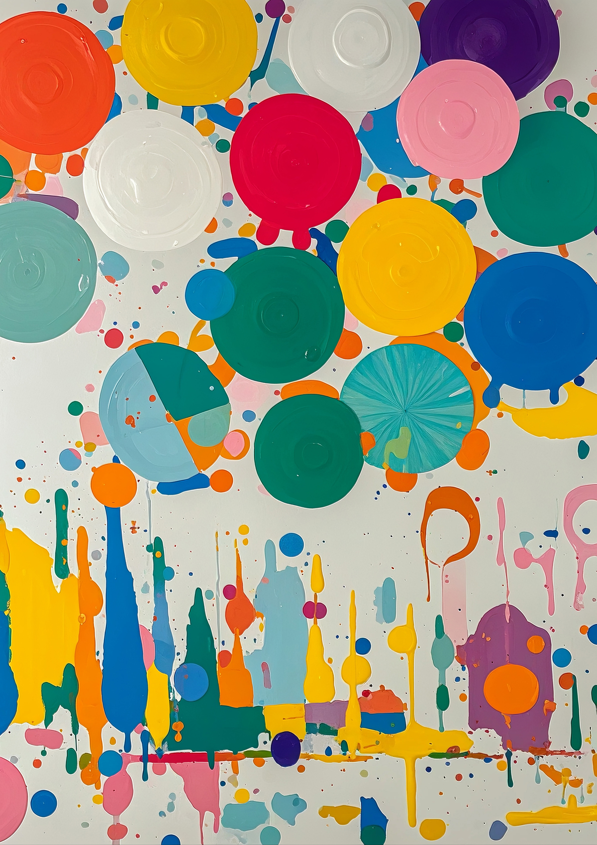 (画像をクリックすると全体表示になります)この作品は、画面中央の円形(ターゲット状)を軸に、放射状・水平・垂直の力学が複雑に絡み合うダイナミックな抽象作品です。色味はグレイ、青、黄土、少量のオレンジがアクセントとなり、対照的な色のぶつかり合...
