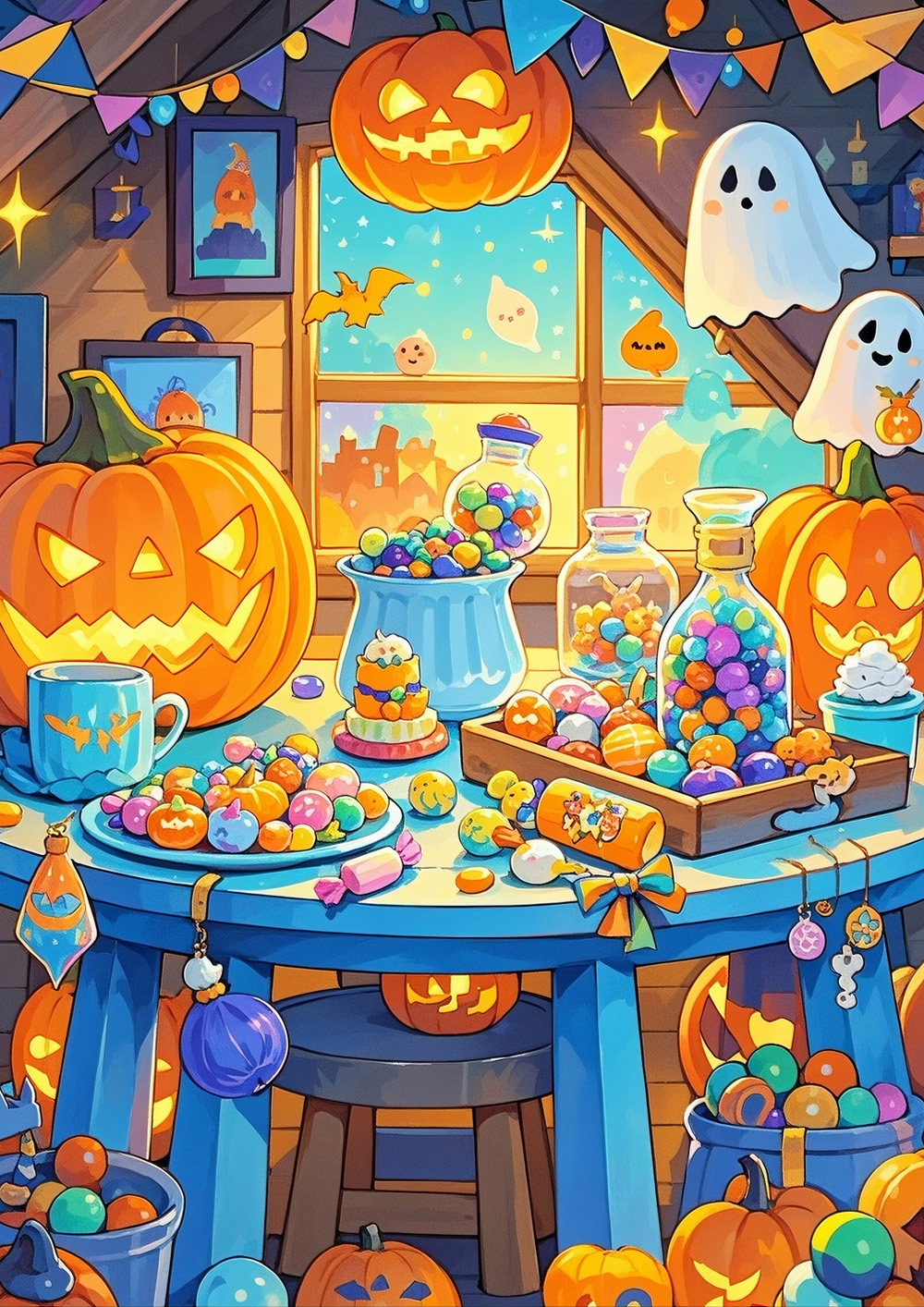 (画像をクリックすると全体表示になります)テーブル一面にキャンディやお菓子があふれる、楽しく華やかなハロウィンイラストです。大きなジャックオーランタンと優しいゴーストが空間を彩り、ワクワクする“お菓子パーティー”の様子を表情豊かに描いていま...