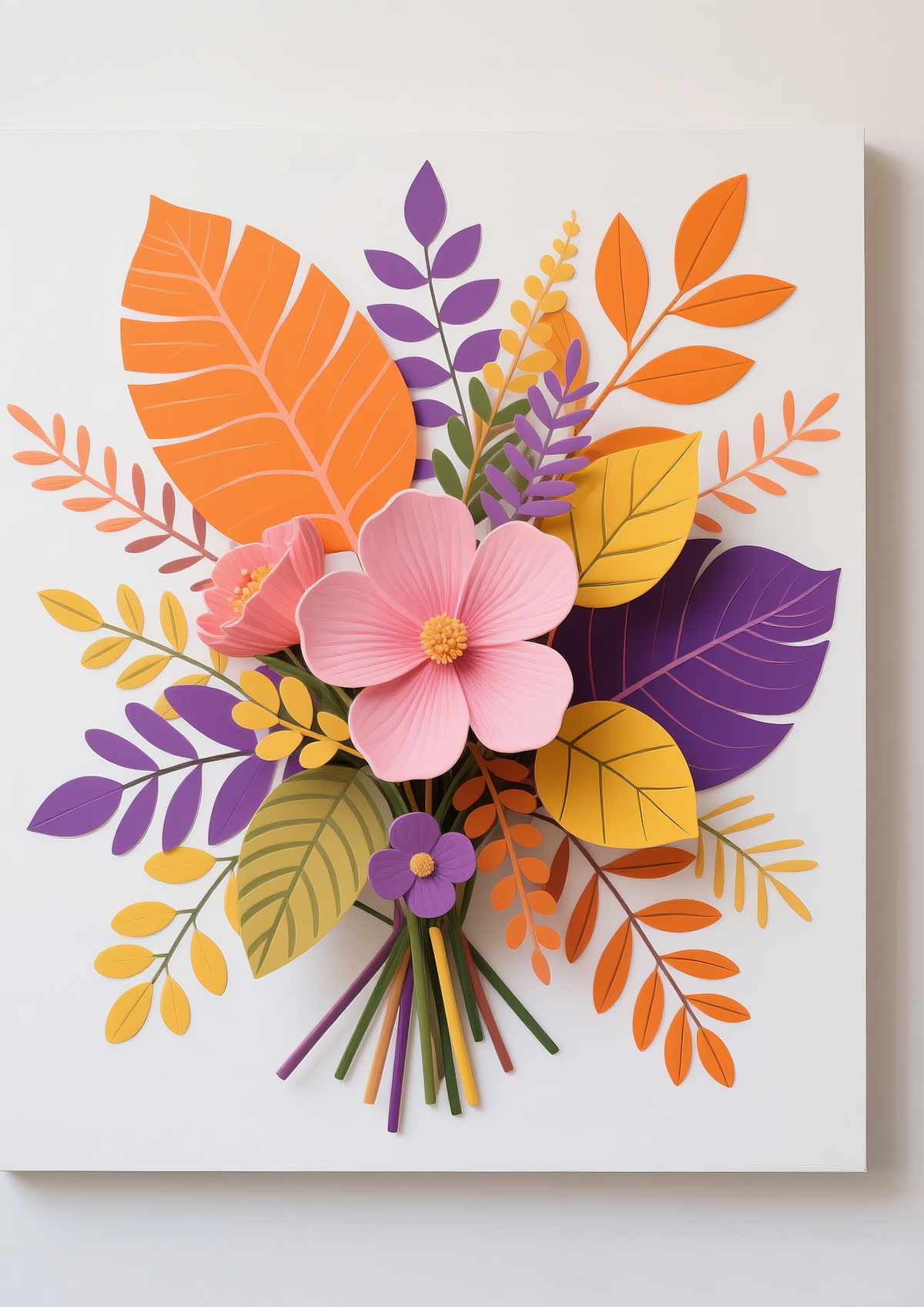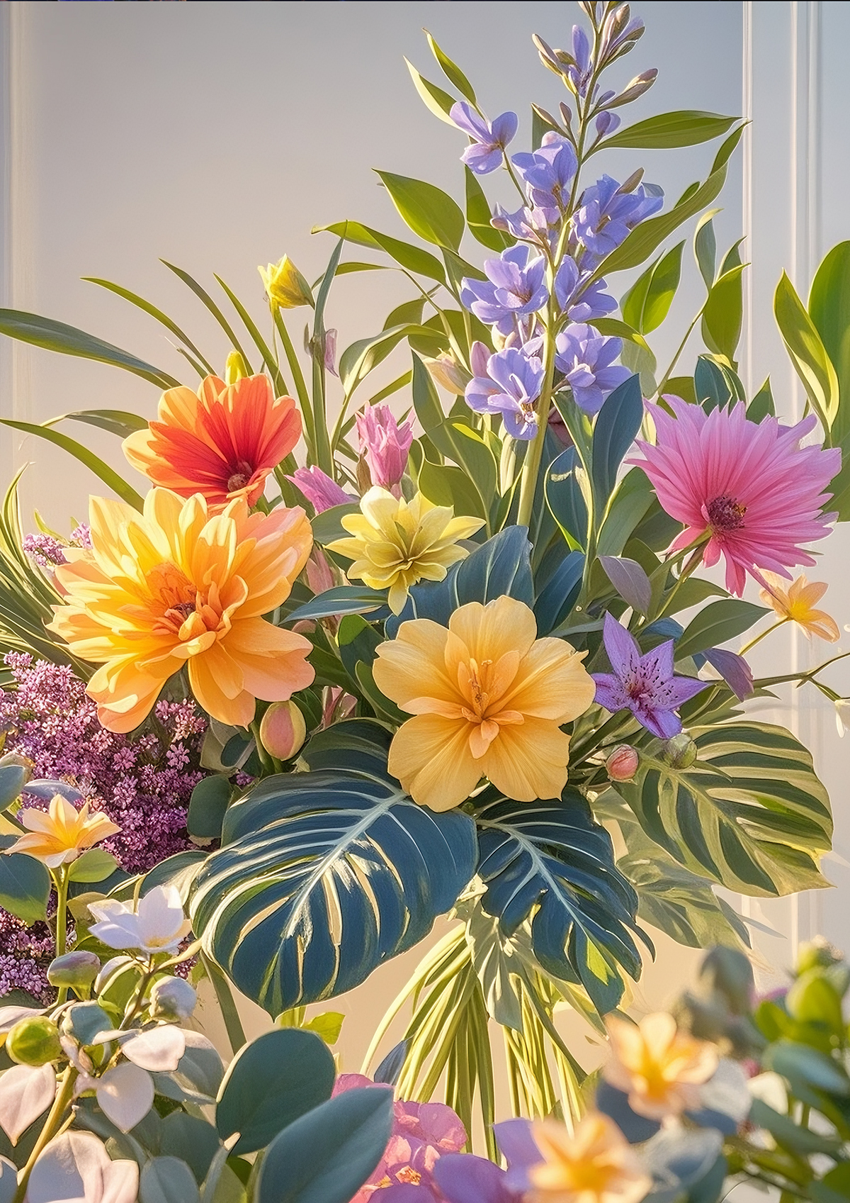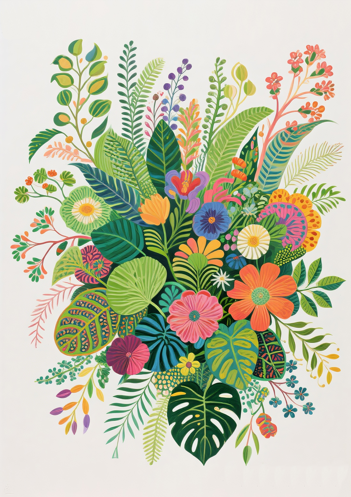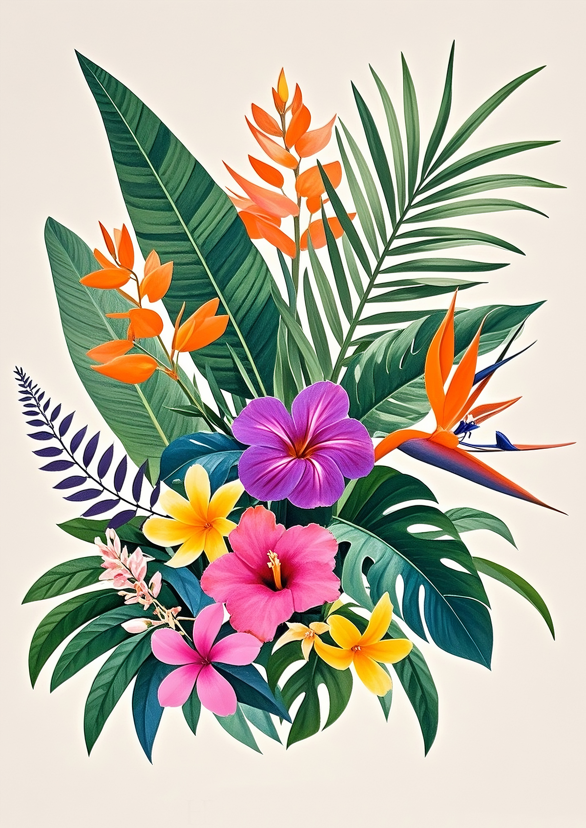 (画像をクリックすると全体表示になります)この作品は、トロピカルな植物と花々を鮮やかに描き出した非常にエネルギッシュなフラワーアートです。オレンジ、ピンク、紫、黄色といった南国を思わせるカラーパレットが目を惹き、リズミカルに配置された花と葉...