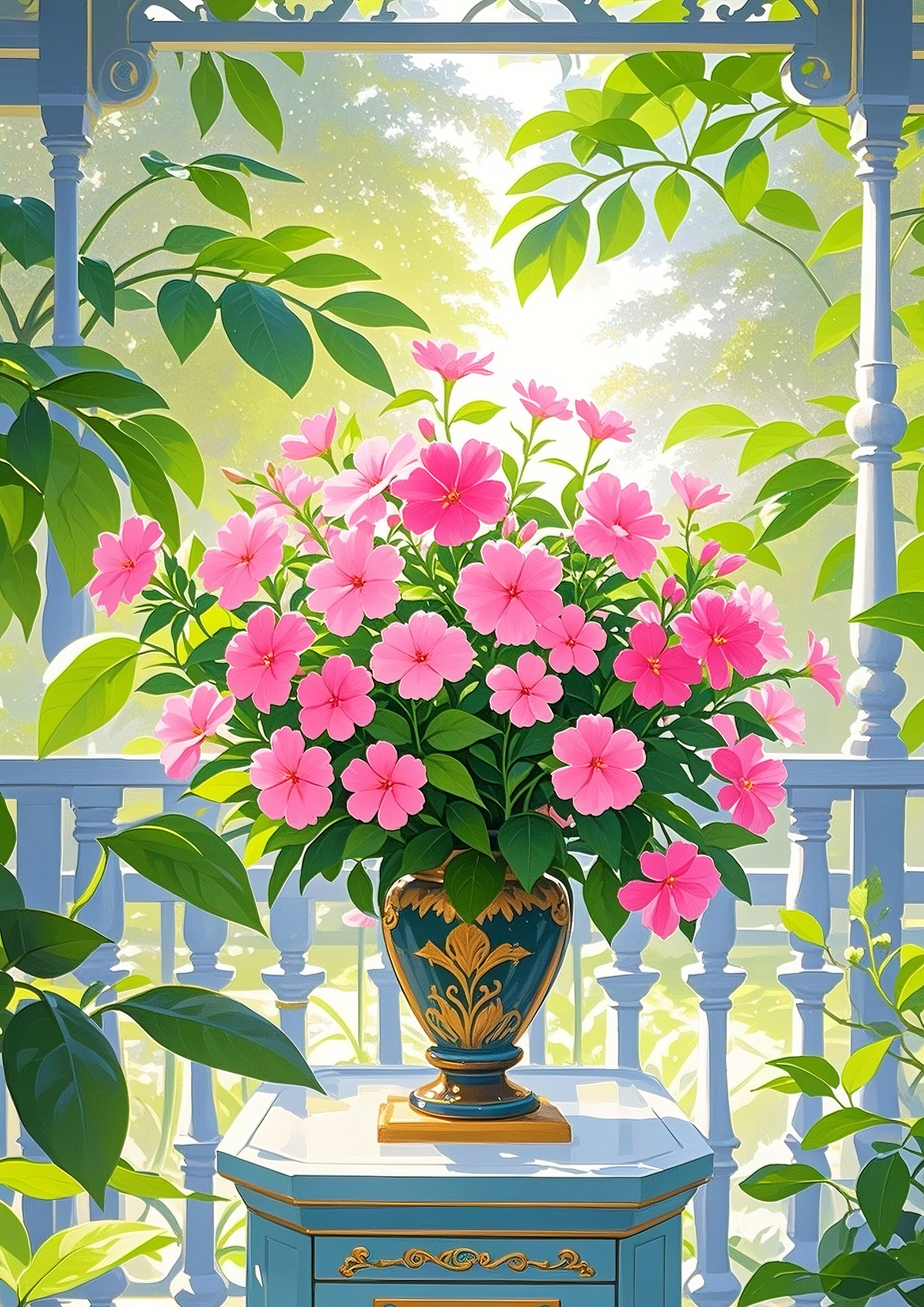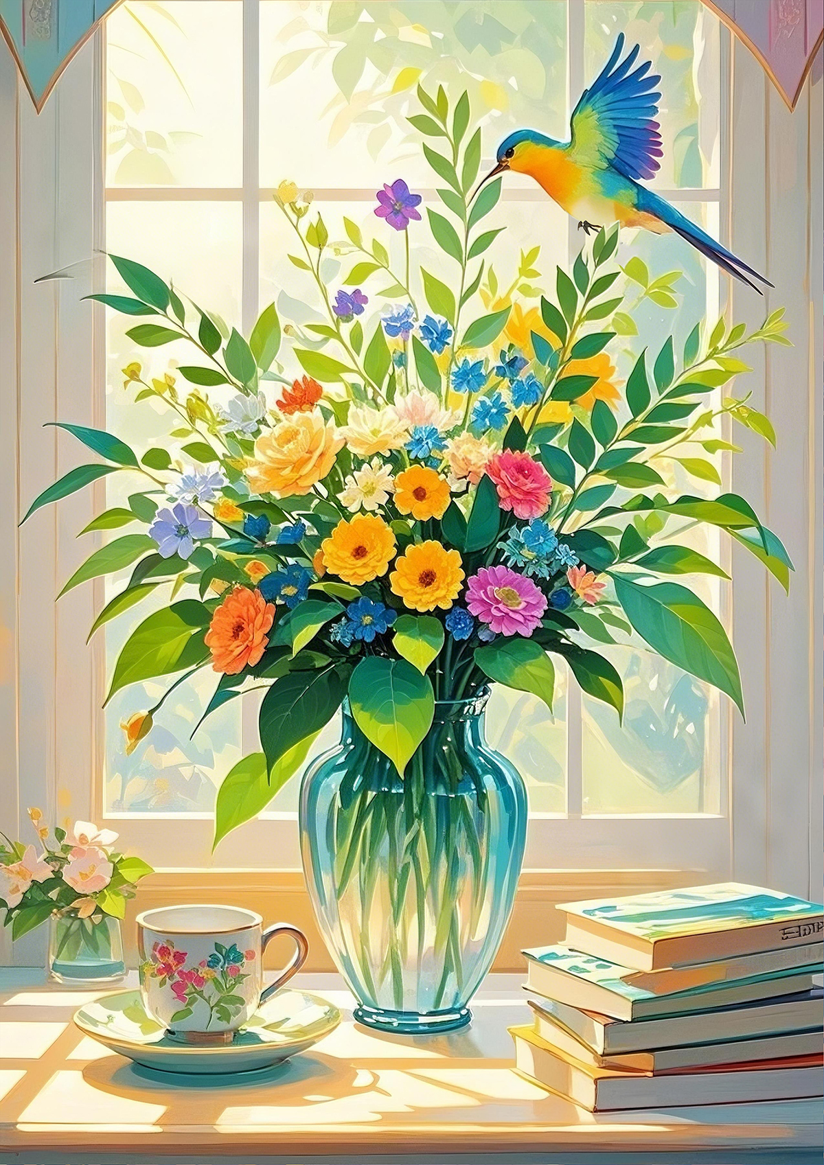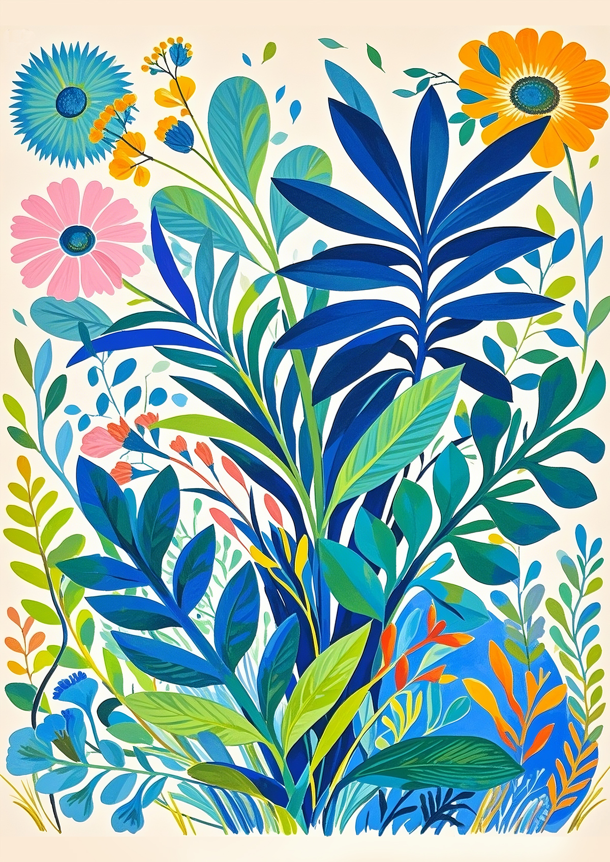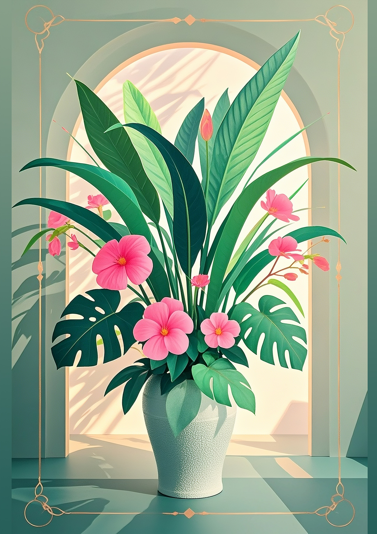(画像をクリックすると全体表示になります)この作品は、トロピカルな植物と花々を鮮やかに描き出した非常にエネルギッシュなフラワーアートです。オレンジ、ピンク、紫、黄色といった南国を思わせるカラーパレットが目を惹き、リズミカルに配置された花と葉...