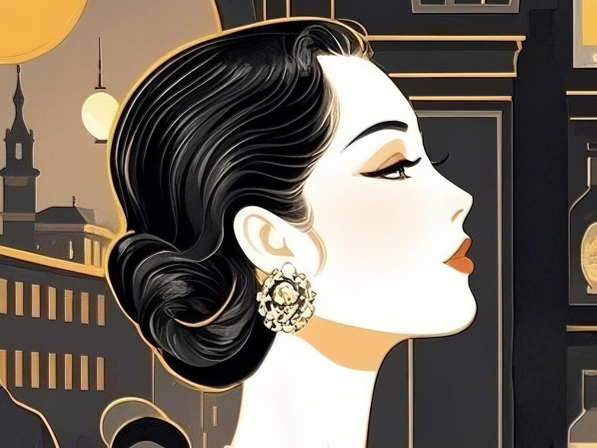 (画像をクリックすると全体表示になります)この作品は、アール・デコ様式を強く感じさせる洗練されたデザインが特徴的です。黒と金を基調とした色彩は、豪華さとモダンな雰囲気を同時に表現し、観る者にエレガントな印象を与えています。 女性の姿は「クラ...