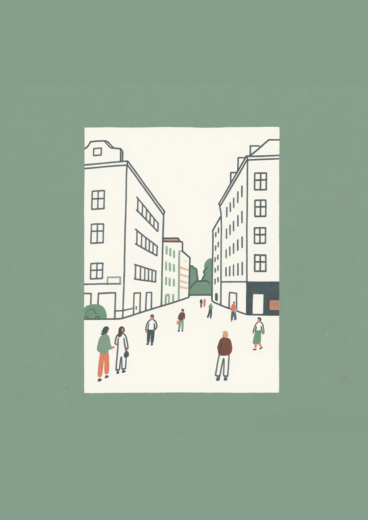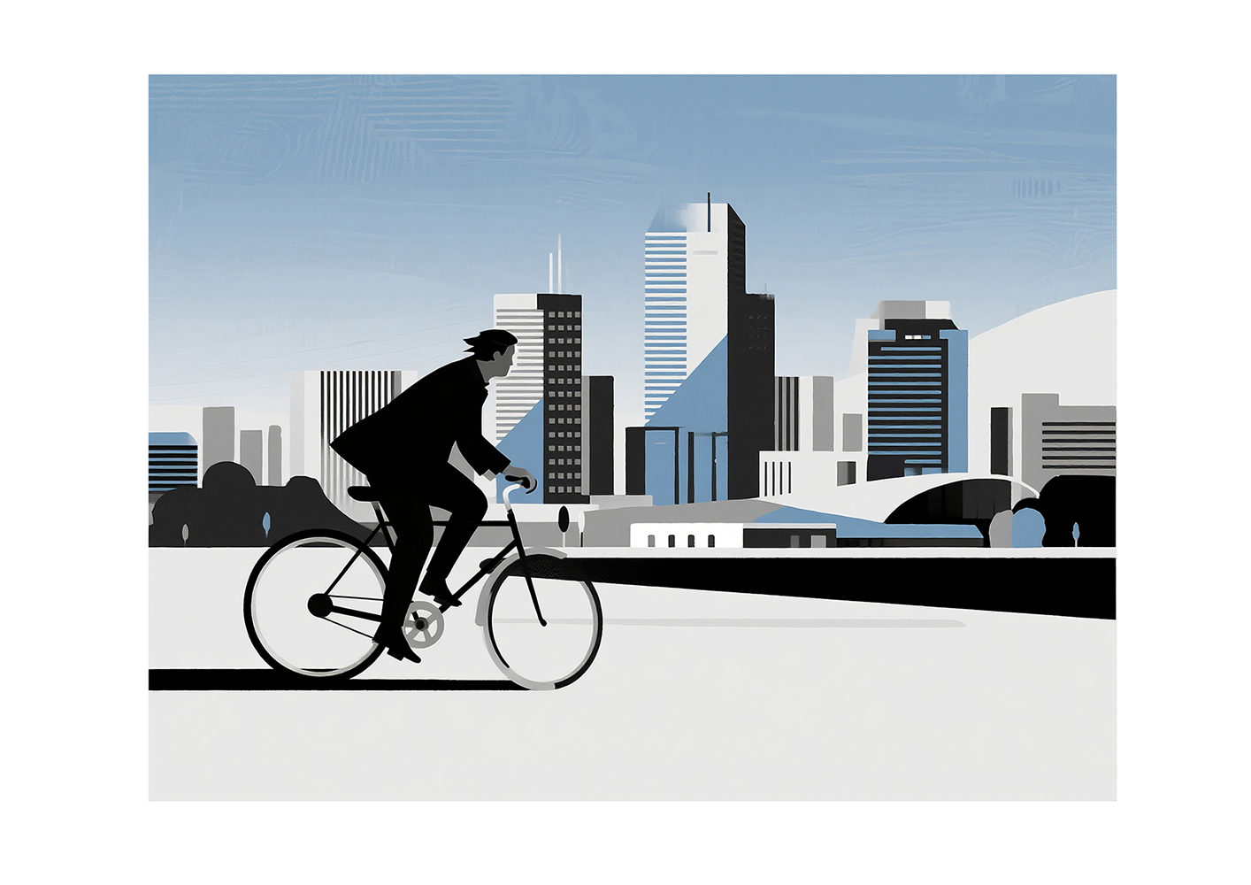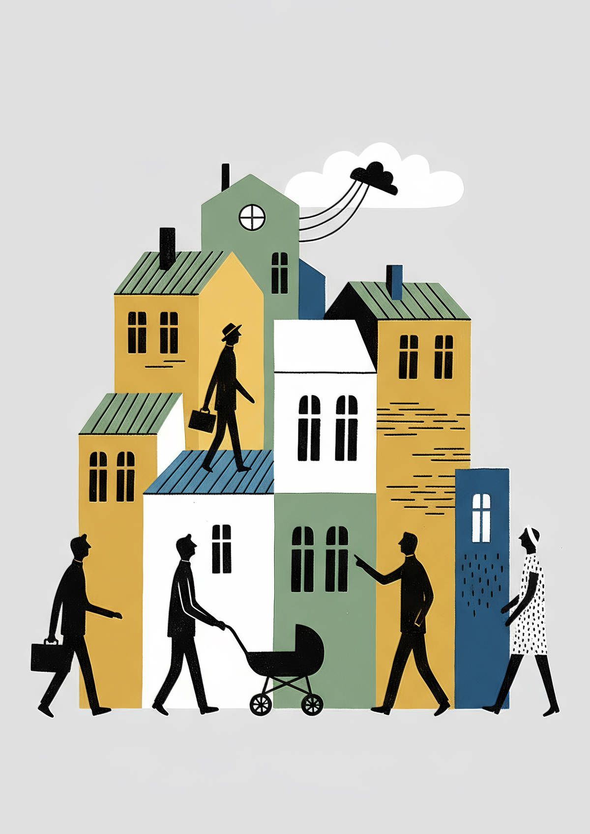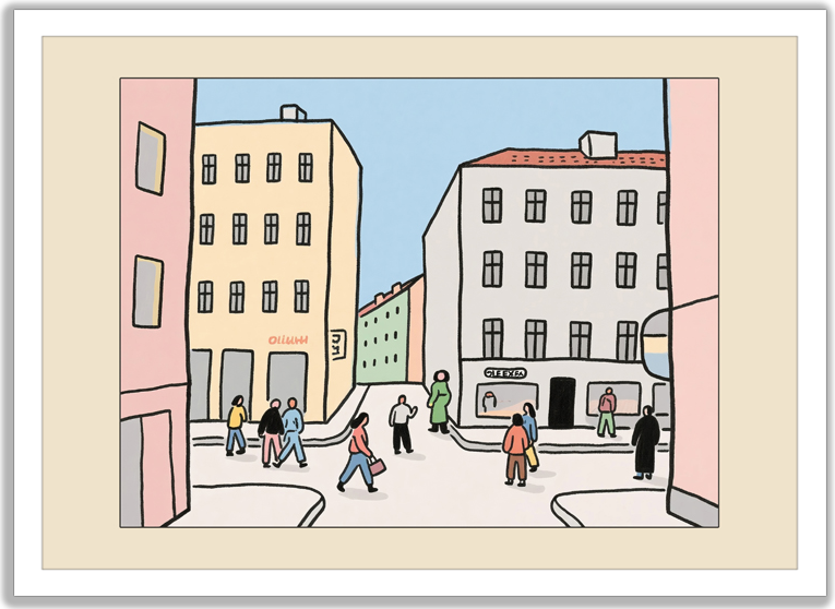 (画像をクリックすると全体表示になります)北欧デザインのような、シンプルで温かみのある街並みを描いた一枚です。 黒と白をベースに黄色をアクセントとして加えることで、街並みのグラフィック感が強調されています。建物の直線と人物の柔らかい動きが対...