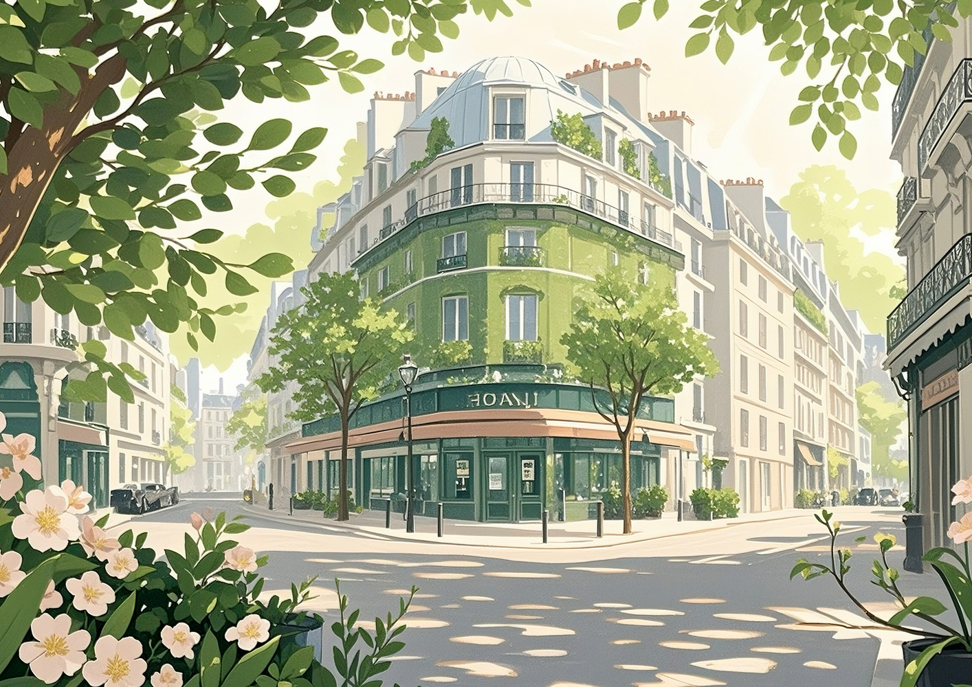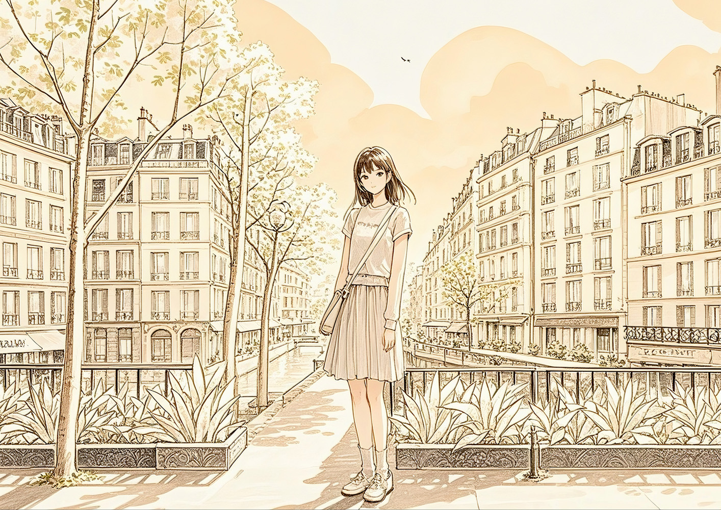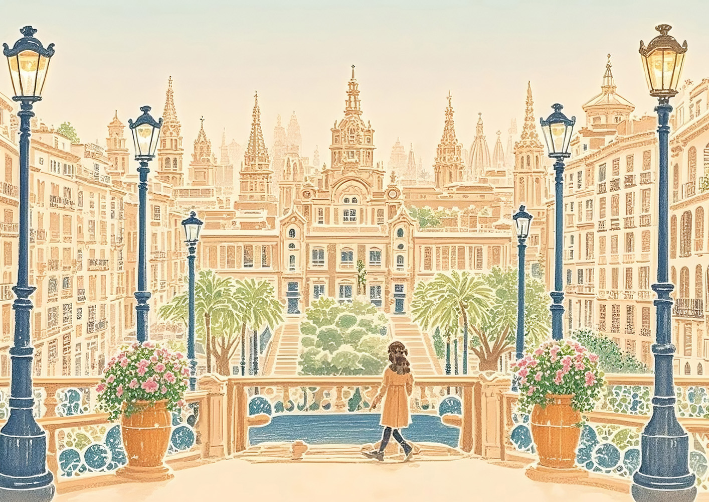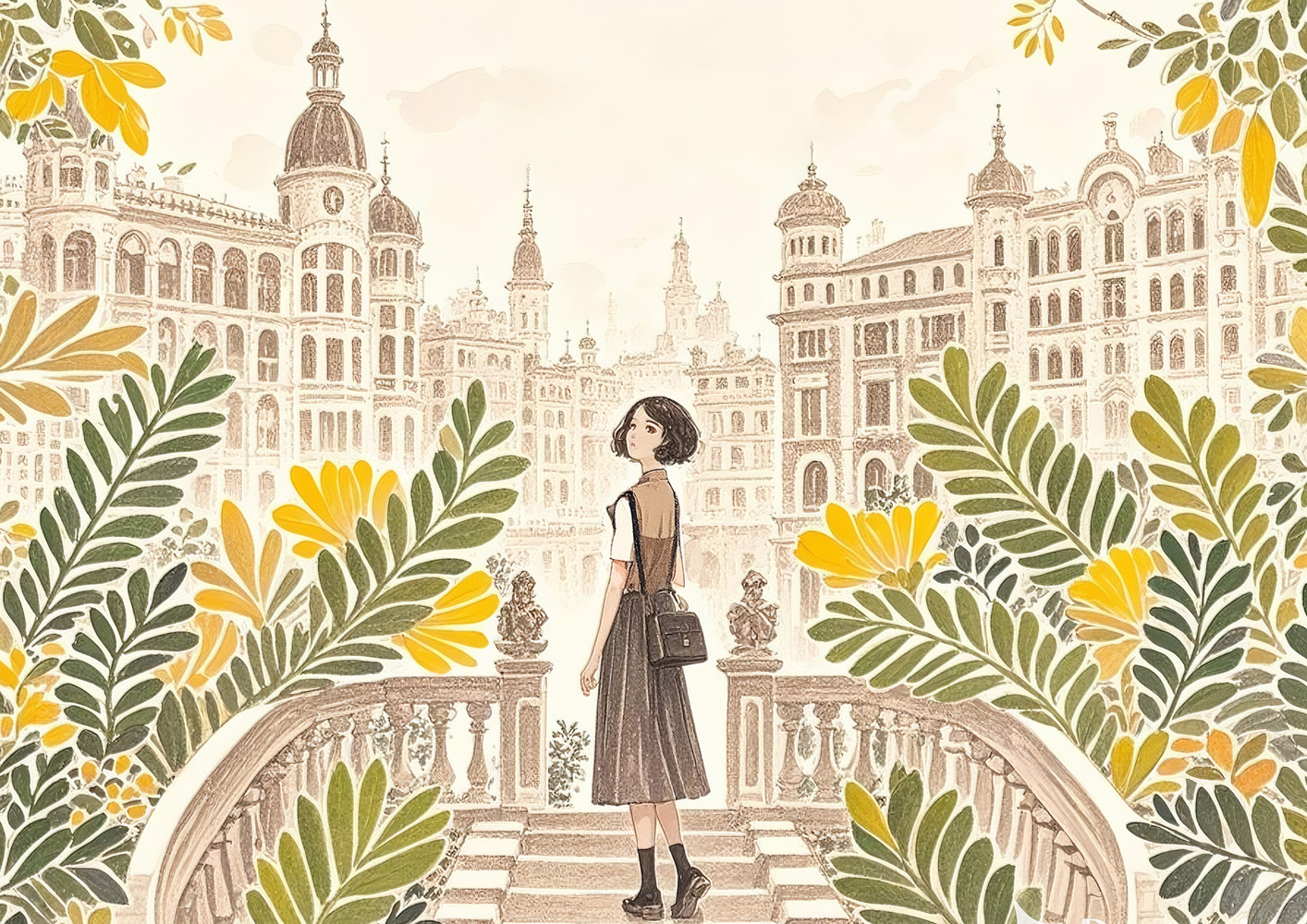 (画像をクリックすると全体表示になります)歴史ある建物と豊かな自然が共鳴する幻想的な風景アート。クラシカルな雰囲気の中に、現代的な感性が息づいています。暖色と緑の調和が心地よく、レトロで幻想的な空気を漂わせています。中央の女性像は鑑賞者の視...