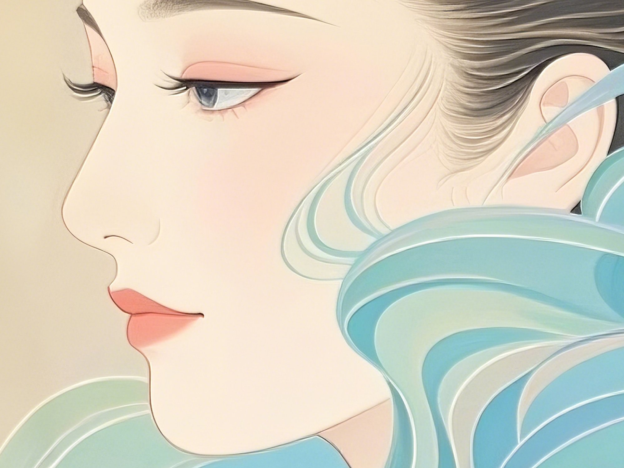 (画像をクリックすると全体表示になります)📝この作品は、日本画風のテイストを持ちつつも、現代的で洗練されたAIアートとして仕上がっています。風を思わせる流麗なブルーのモチーフに包まれた女性が、繊細な線とグラデーションを活かした透明感のある色...