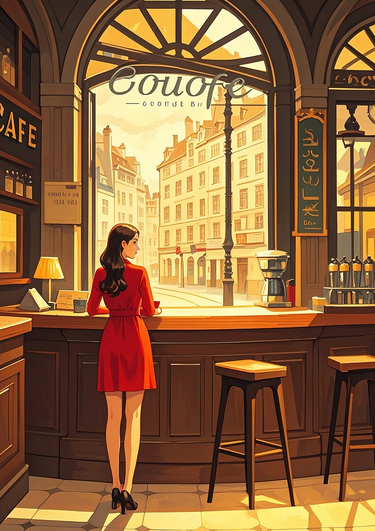 (画像をクリックすると全体表示になります)📝このアートは、温かみのある光と柔らかな影が特徴的な、非常に雰囲気のある作品です。構図は、カフェの窓から街並みを眺める女性というシンプルながらも物語性のあるシーンで、奥行き感と視線の誘導が巧みに表現...