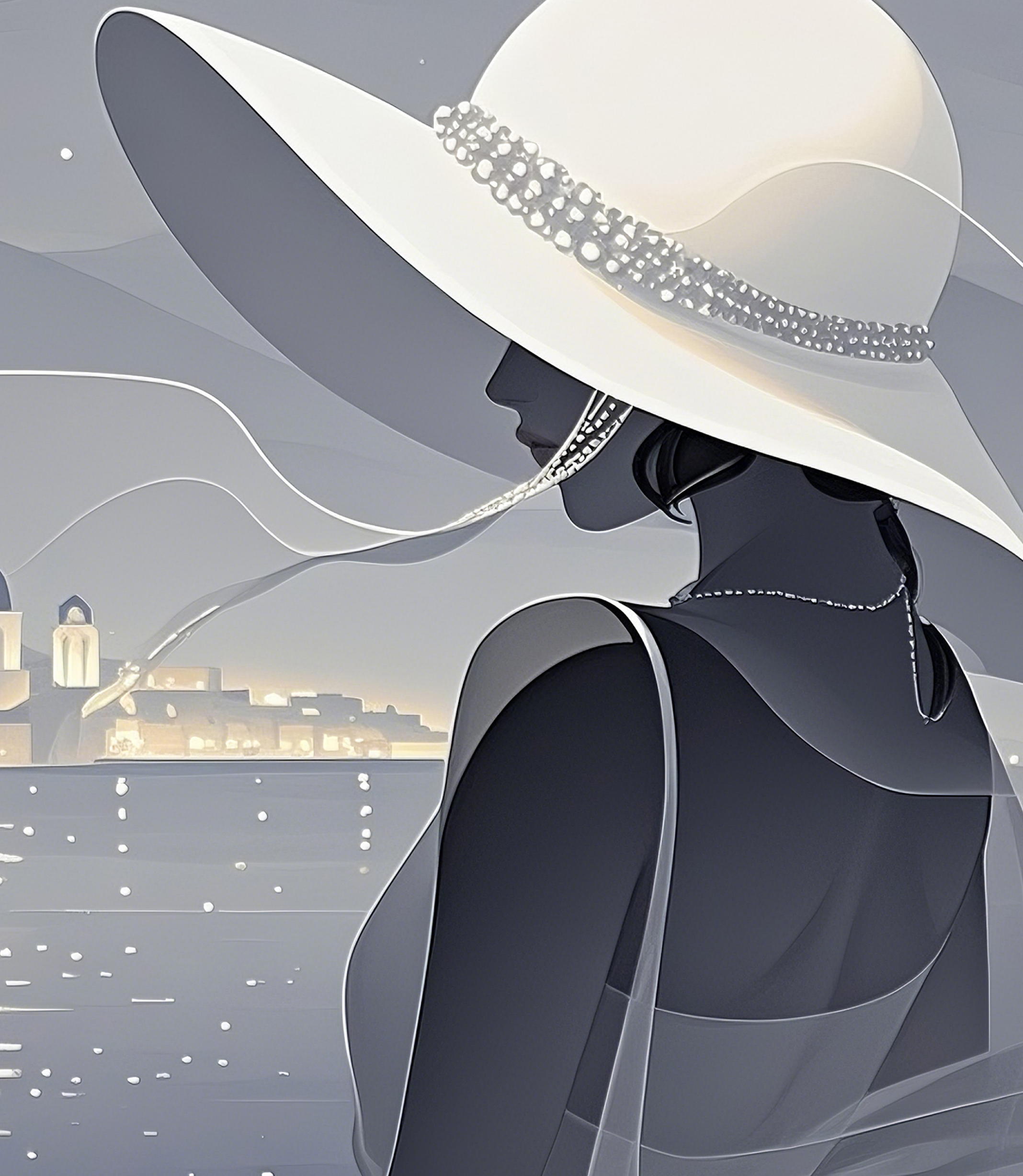 (画像をクリックすると全体表示になります)📝この作品は、モノトーンに近い落ち着いたカラーパレットにより、洗練された上品さと静けさが際立っています。女性のシルエットやドレスの透け感、風に舞う布の表現が非常に繊細で美しく、静かな海辺の情景と調和...