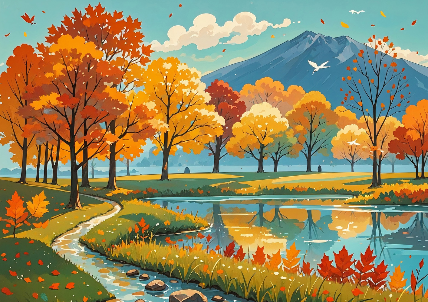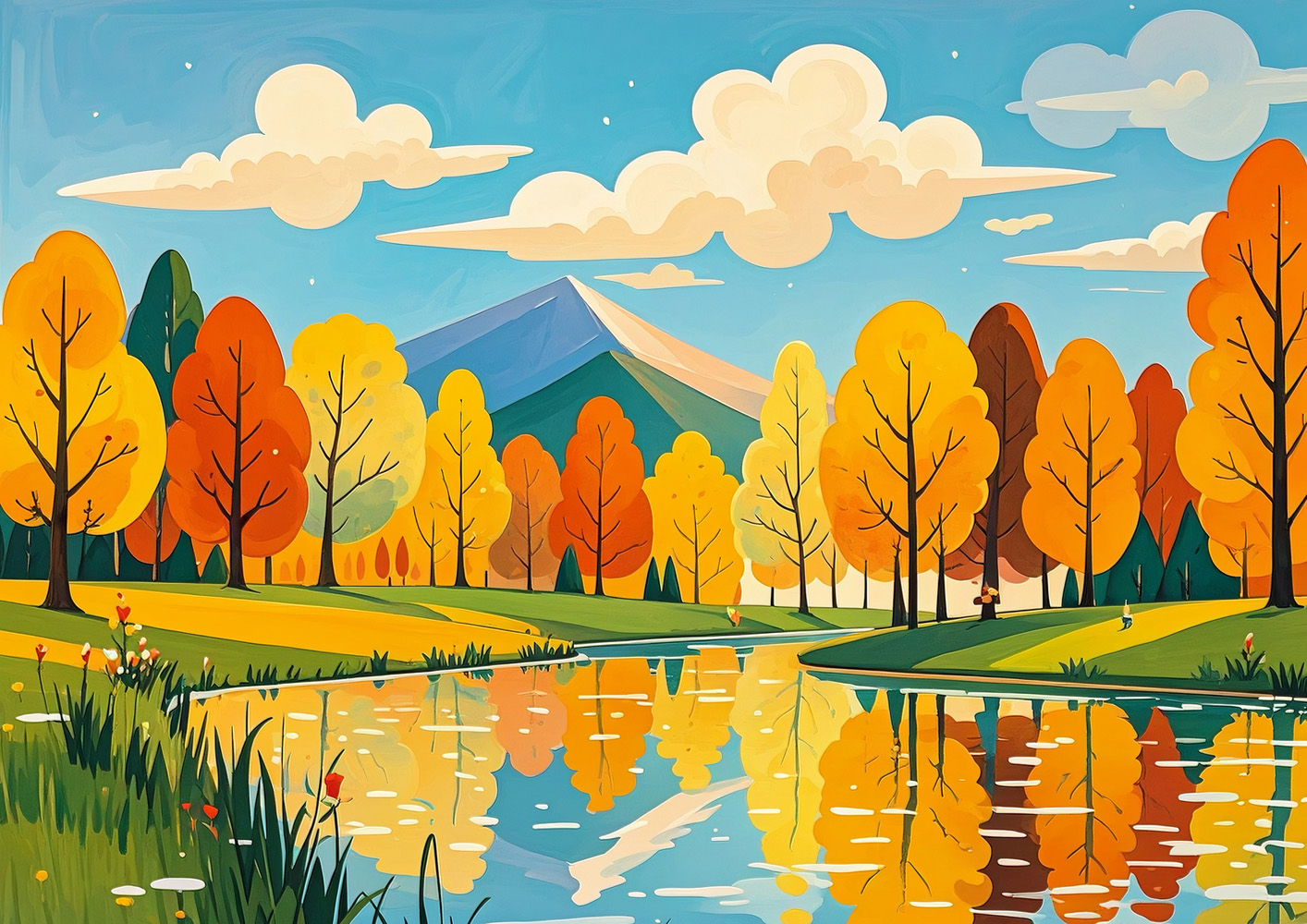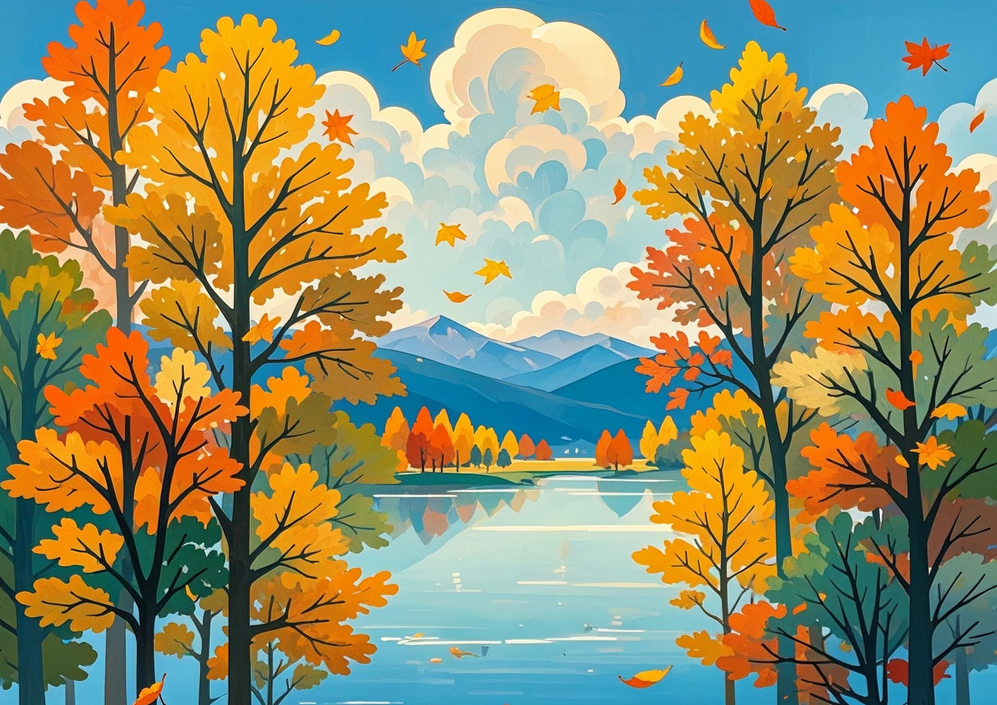 (画像をクリックすると全体表示になります)透き通るような空と色鮮やかな木々が、湖面に美しく反射する秋の魅力を丁寧に描いたアートです。明るいブルーと暖色系の葉のコントラストが心地よく、空間を爽やかに彩ります。静寂と温もりが同居するバランスの良...