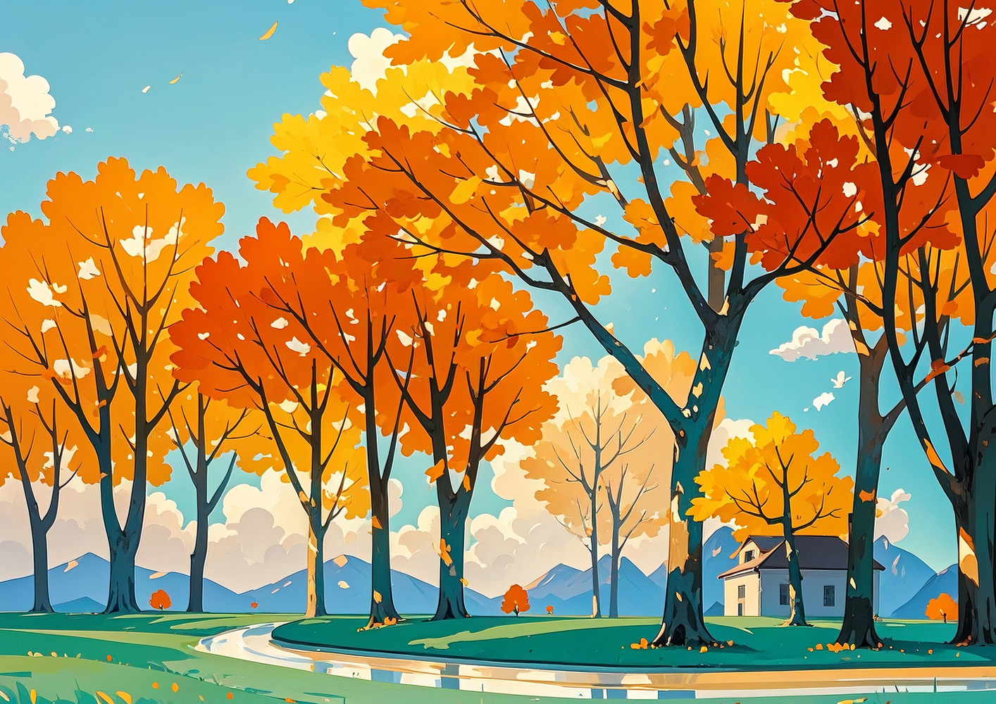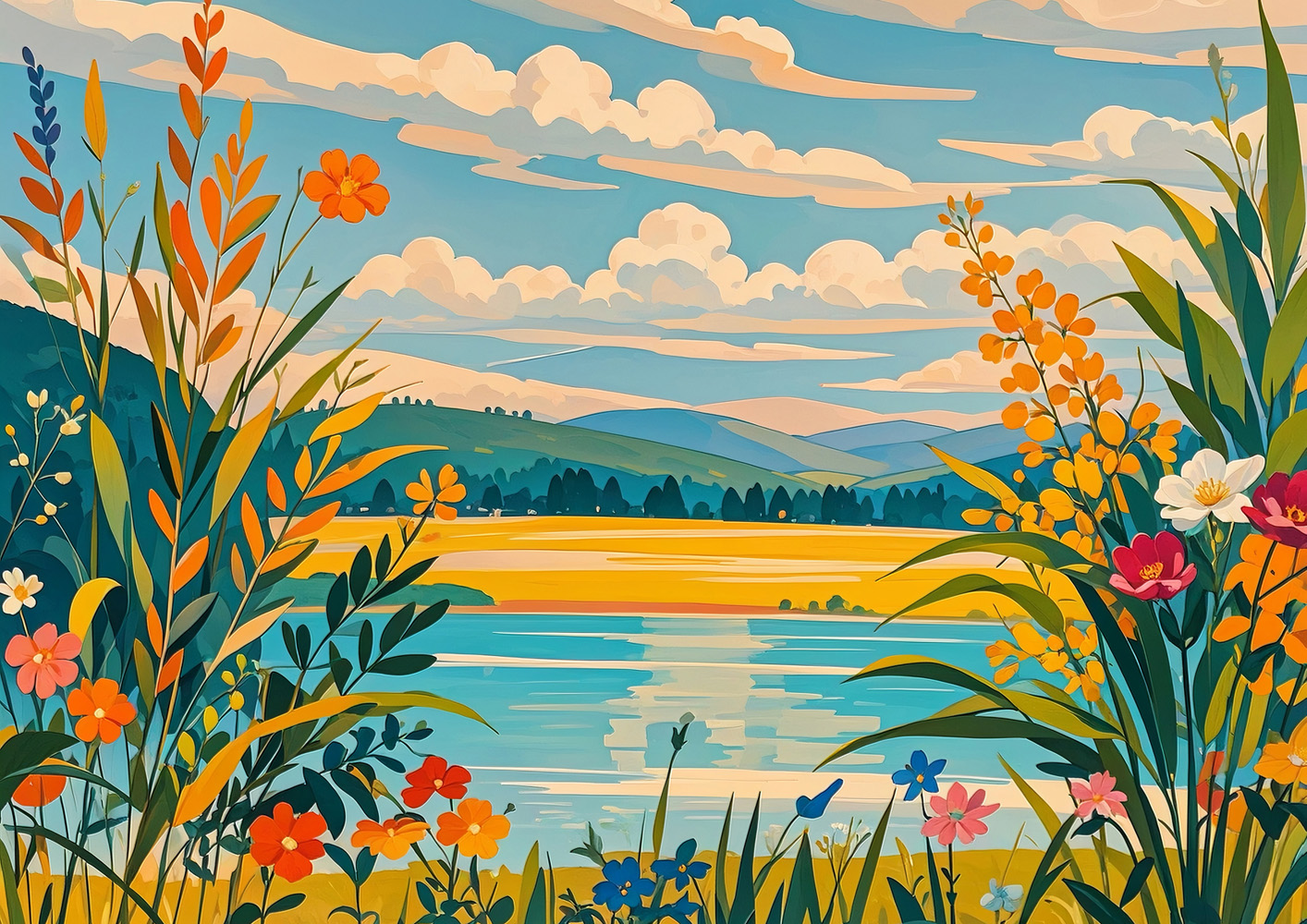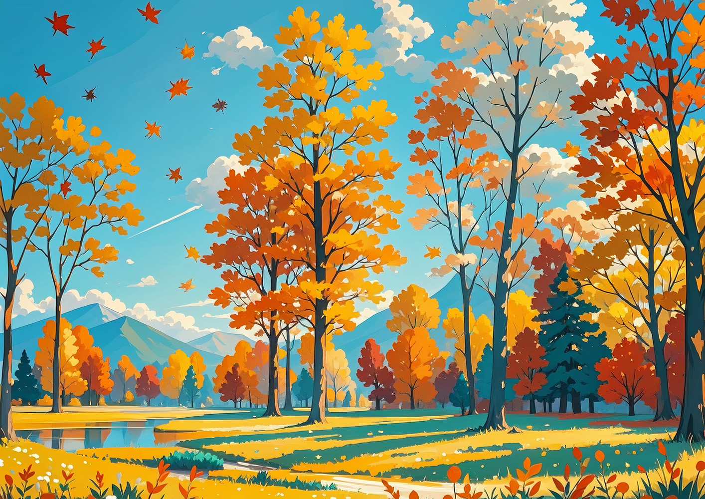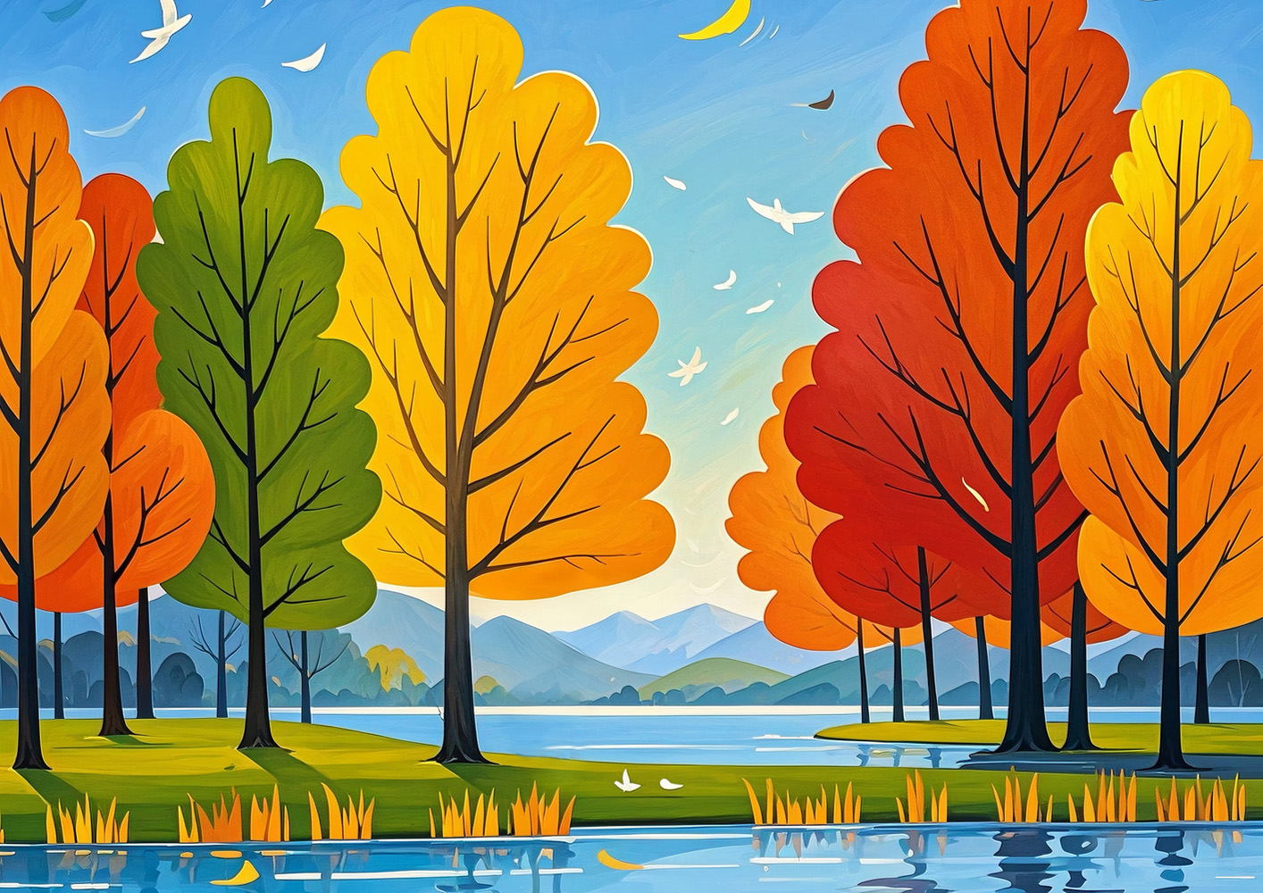 (画像をクリックすると全体表示になります)透き通るような空と色鮮やかな木々が、湖面に美しく反射する秋の魅力を丁寧に描いたアートです。明るいブルーと暖色系の葉のコントラストが心地よく、空間を爽やかに彩ります。静寂と温もりが同居するバランスの良...