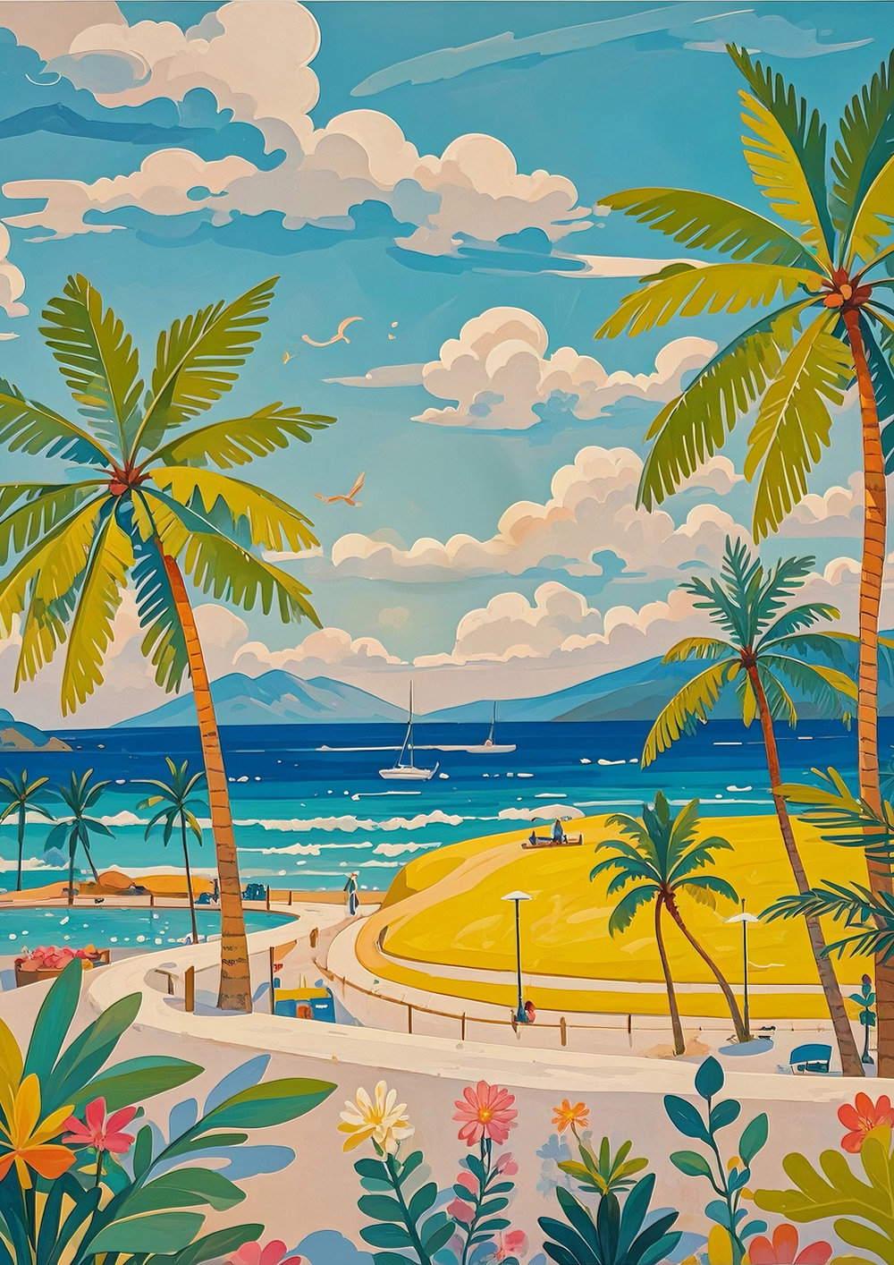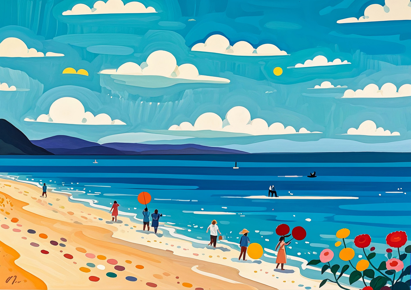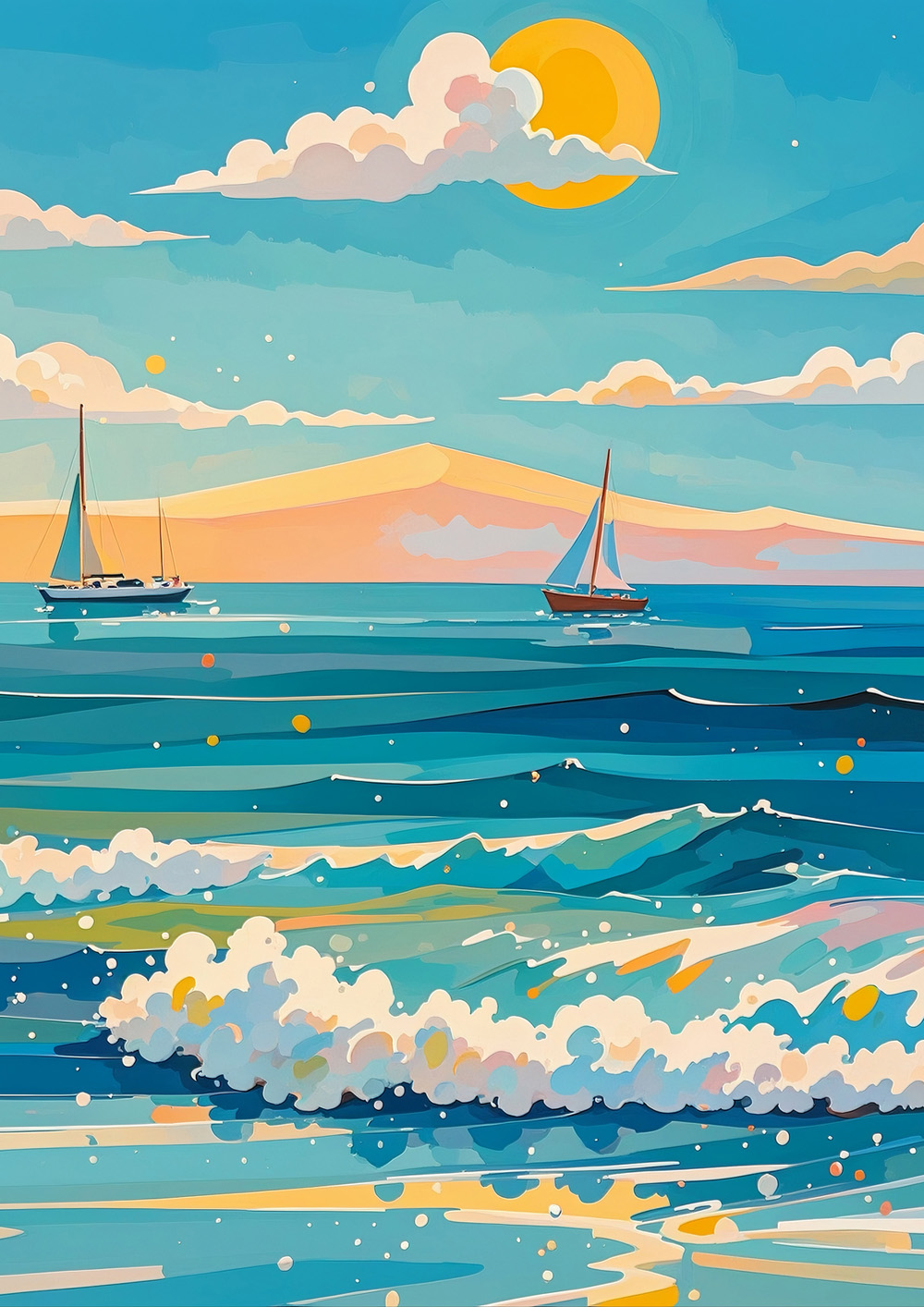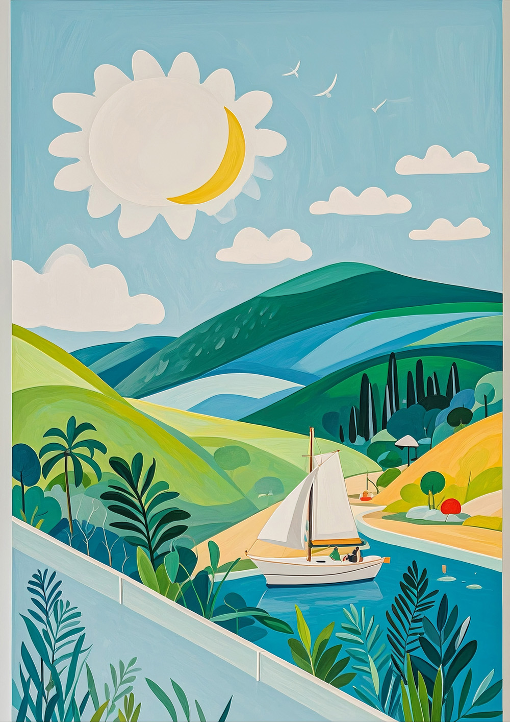 (画像をクリックすると全体表示になります)明るい太陽の下、緑豊かな丘をゆったりと航行する小さなヨットが描かれた爽やかな一枚です。柔らかな空のブルーと、丘の緑のコントラストが美しく、のどかな夏の休日を想起させるような穏やかさに満ちています。自...