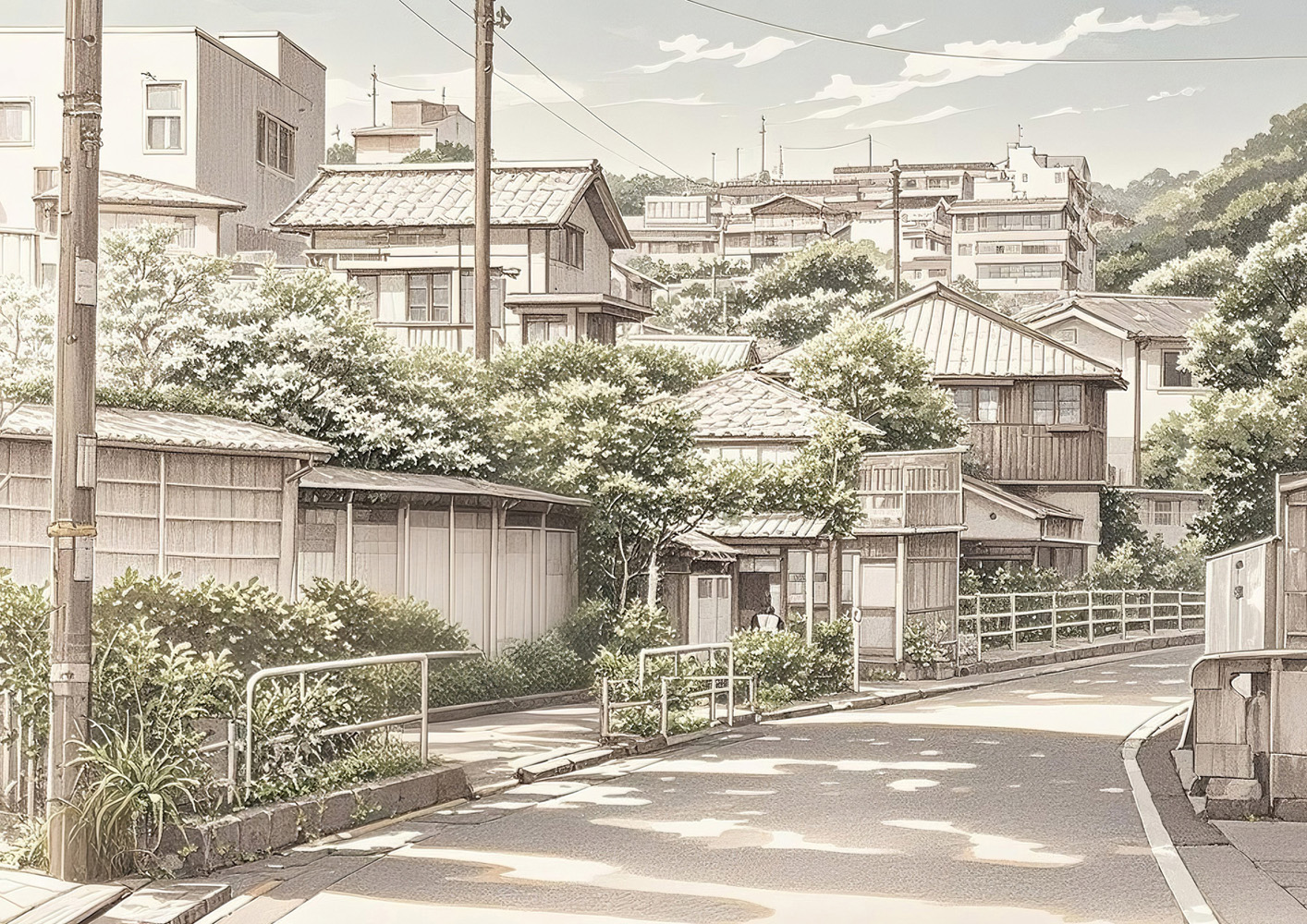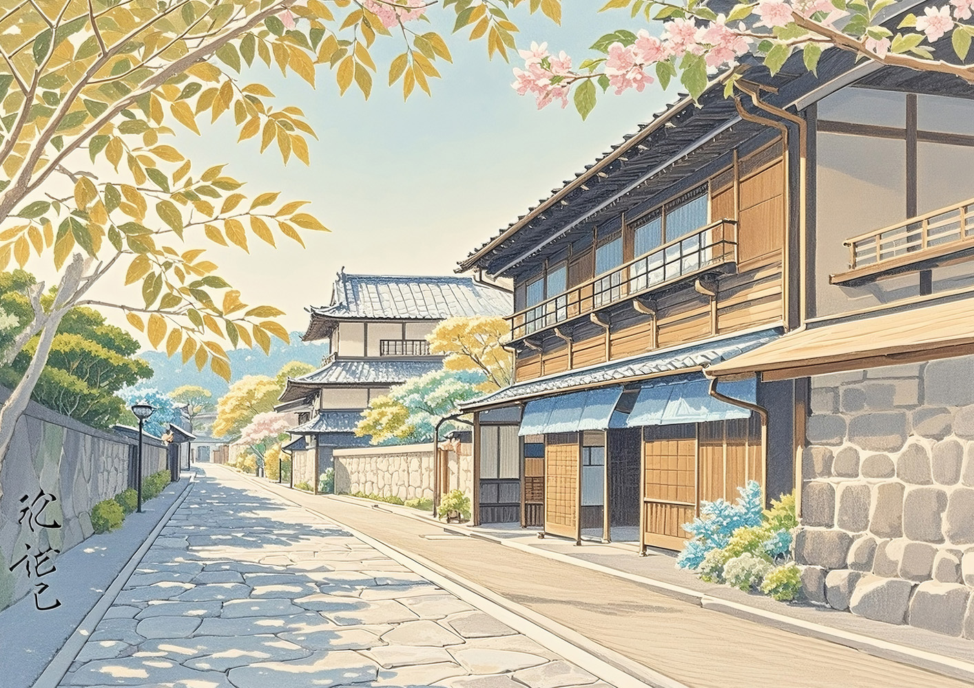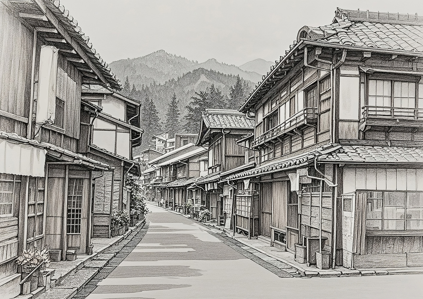 (画像をクリックすると全体表示になります)細な線描と陰影で、古い木造の町並みを描いたモノクロ作品。細部まで描き込まれた建築の質感と遠近感が、まるで鉛筆スケッチや銅版画のような味わいを醸し出します。静かな郷愁と職人技のような繊細さが魅力の一枚...