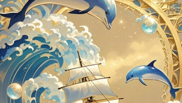 光の波とイルカに導かれる航海アート。前向きな気持ちや軽さを求める方へ。