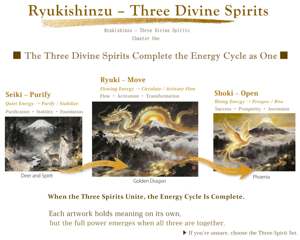 A spiritual art series inspired by Japanese energy philosophy. Each piece represents a stage of inner transformation — Purify, Move, and Open.